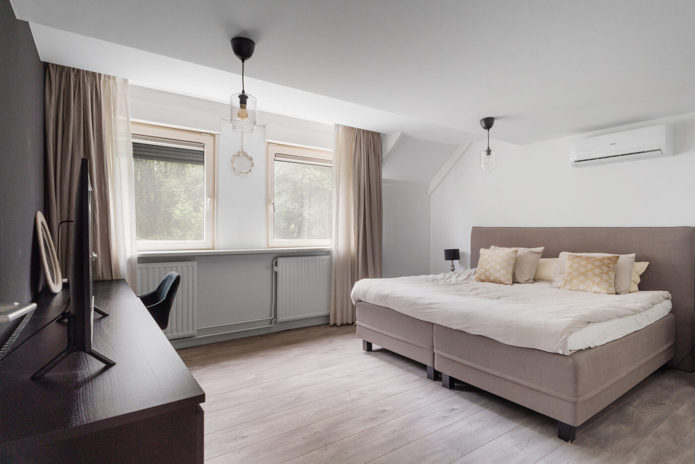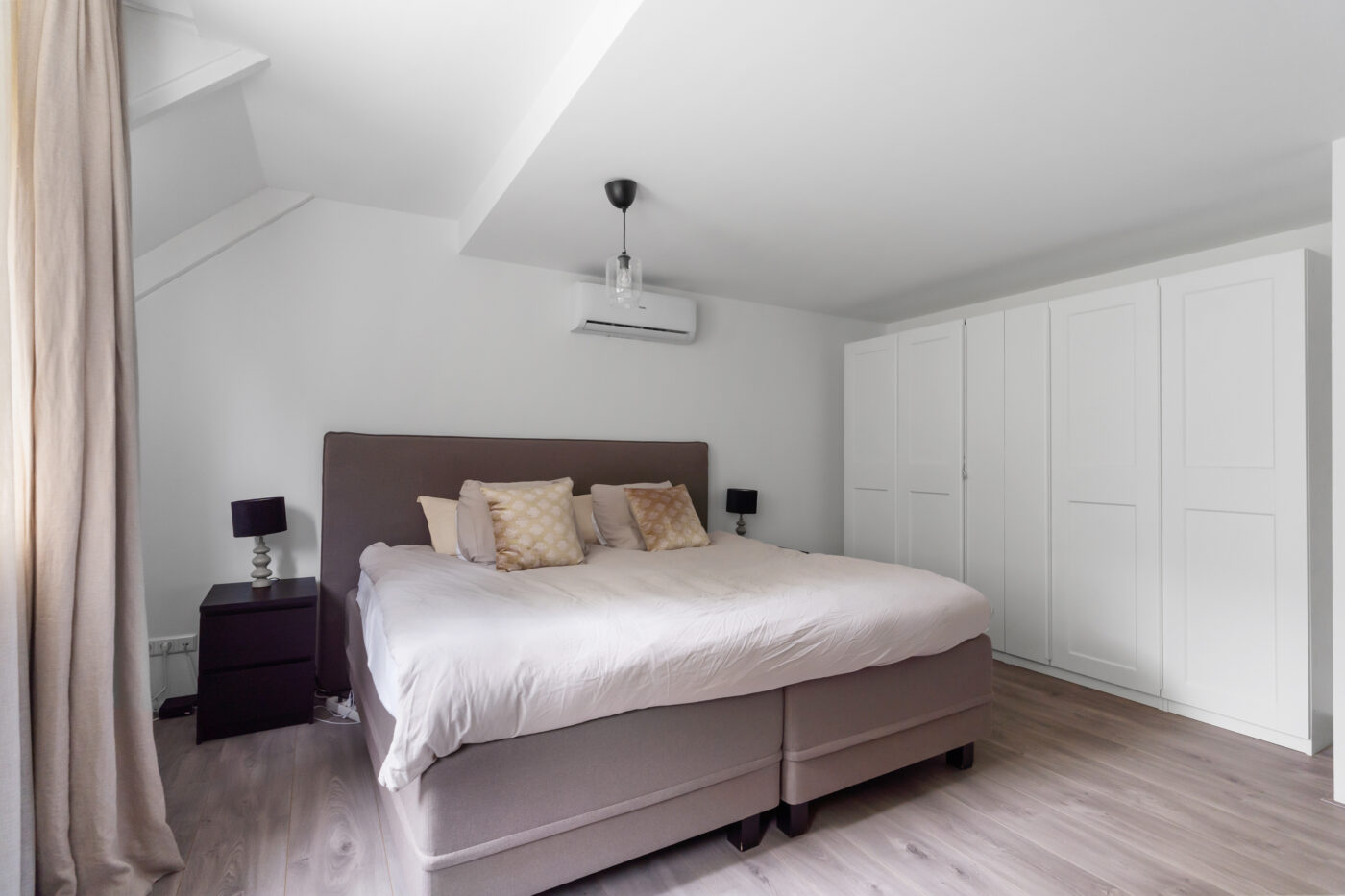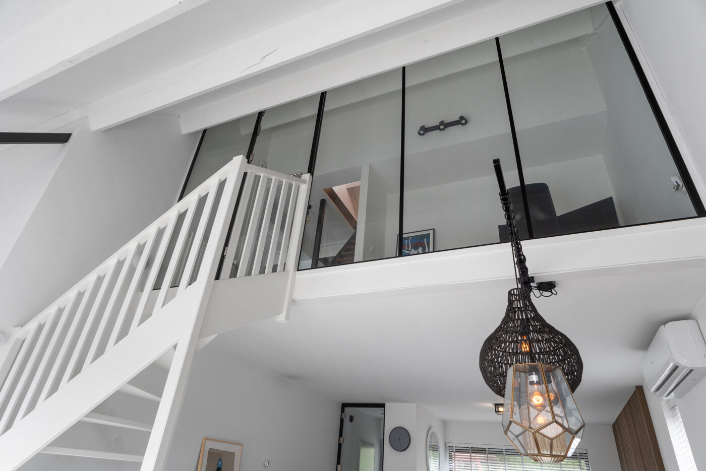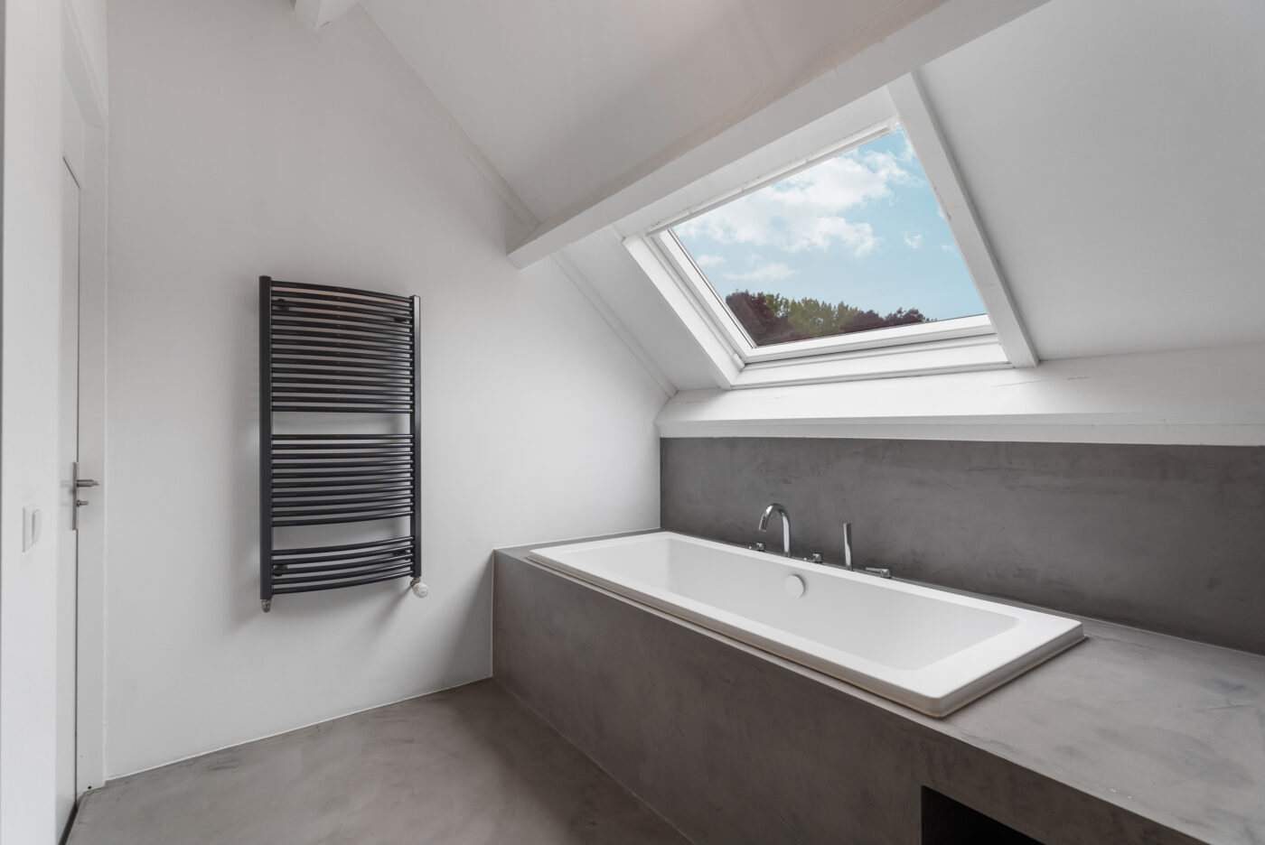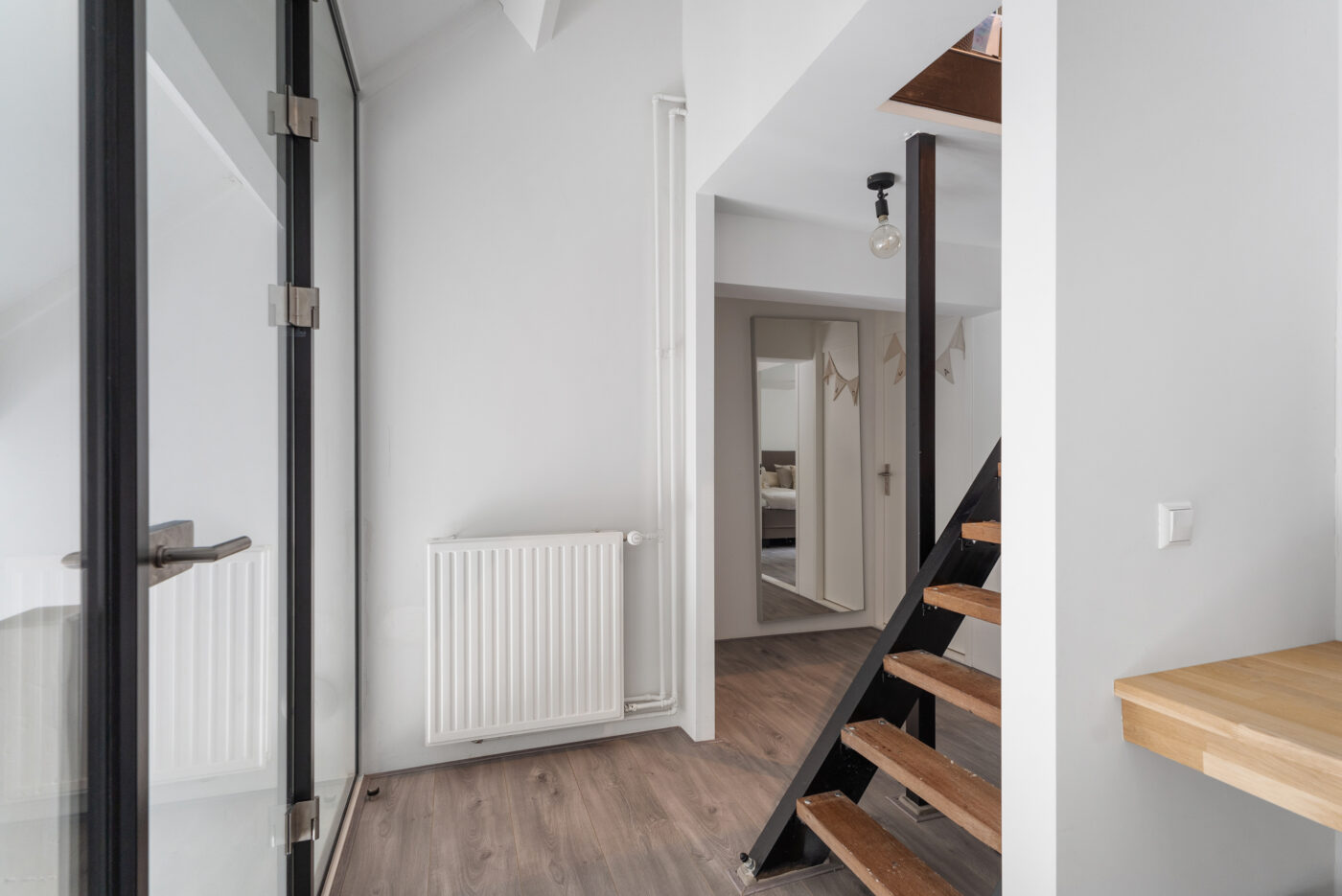 Een glazen pui (vide) zorgt voor een open verbinding met de woonkamer beneden en houdt de warmte goed vast. Hier is een fijne werkplek gecreëerd, ideaal voor thuiswerken. Op deze verdieping bevinden zich twee ruime slaapkamers met airco en rolluiken. De afwerking is van hoog niveau met gestucte wanden, plafonds en een nette laminaatvloer. De moderne badkamer heeft een betonlook afwerking met geïntegreerd ligbad, ruime inloopdouche, wastafelmeubel, vrijhangend toilet, designradiator en een dakraam voor daglicht en ventilatie.