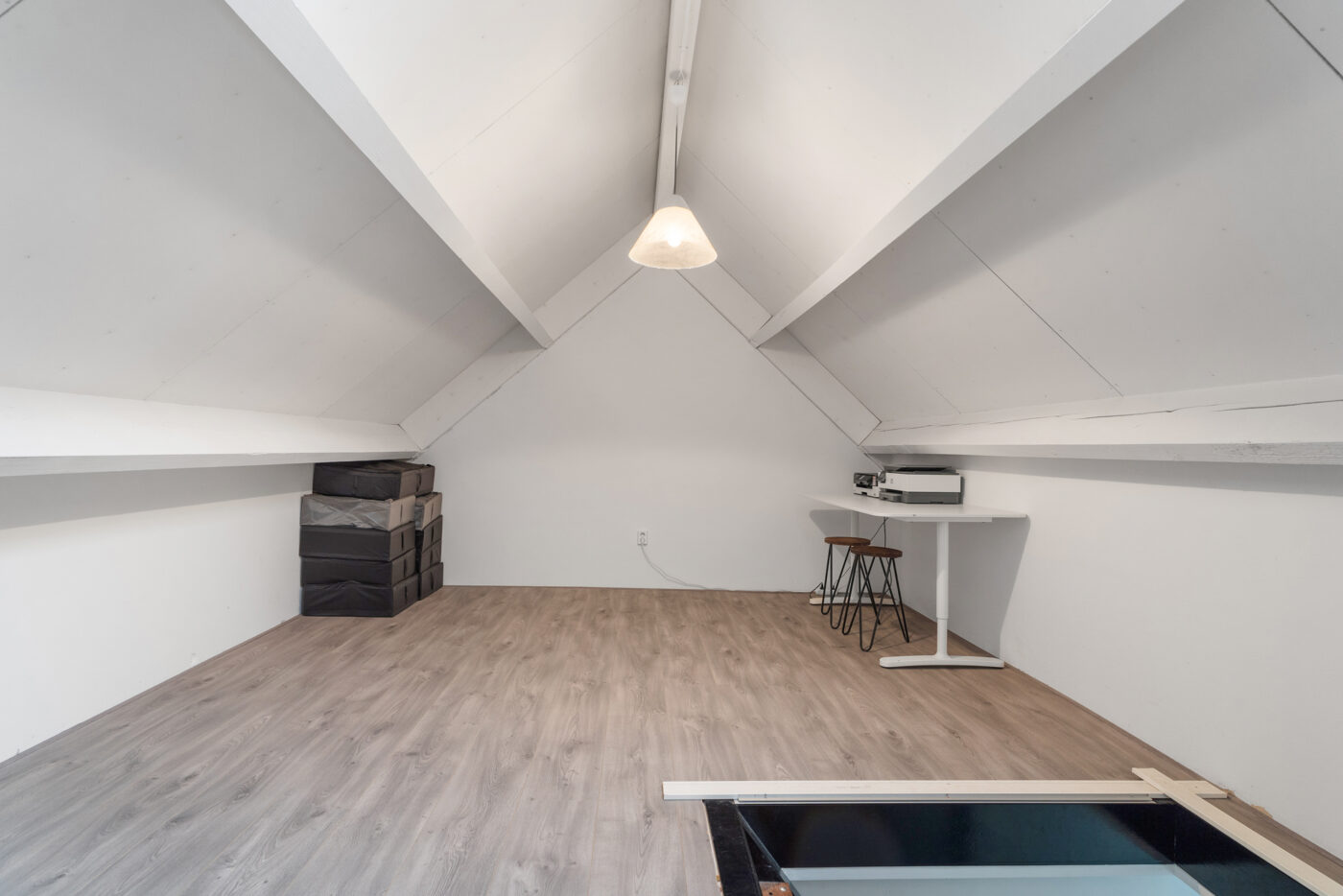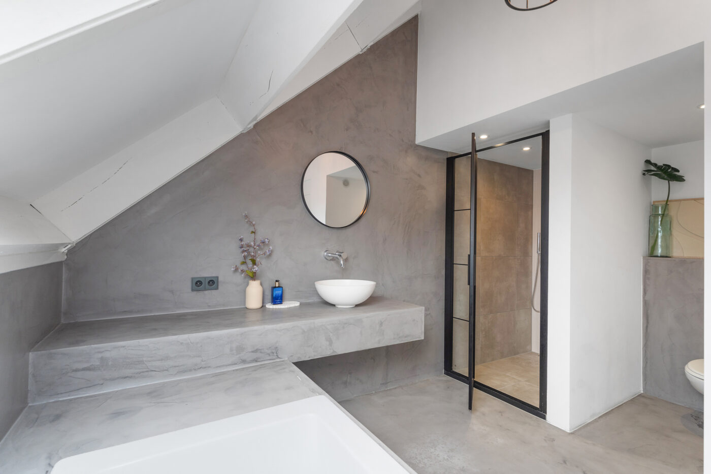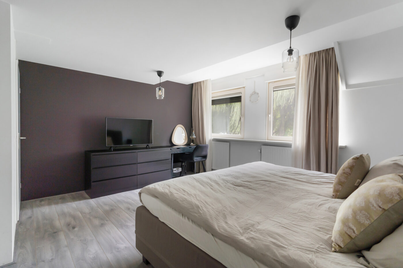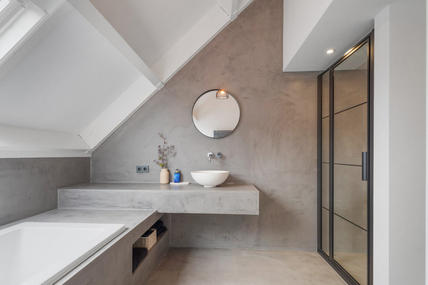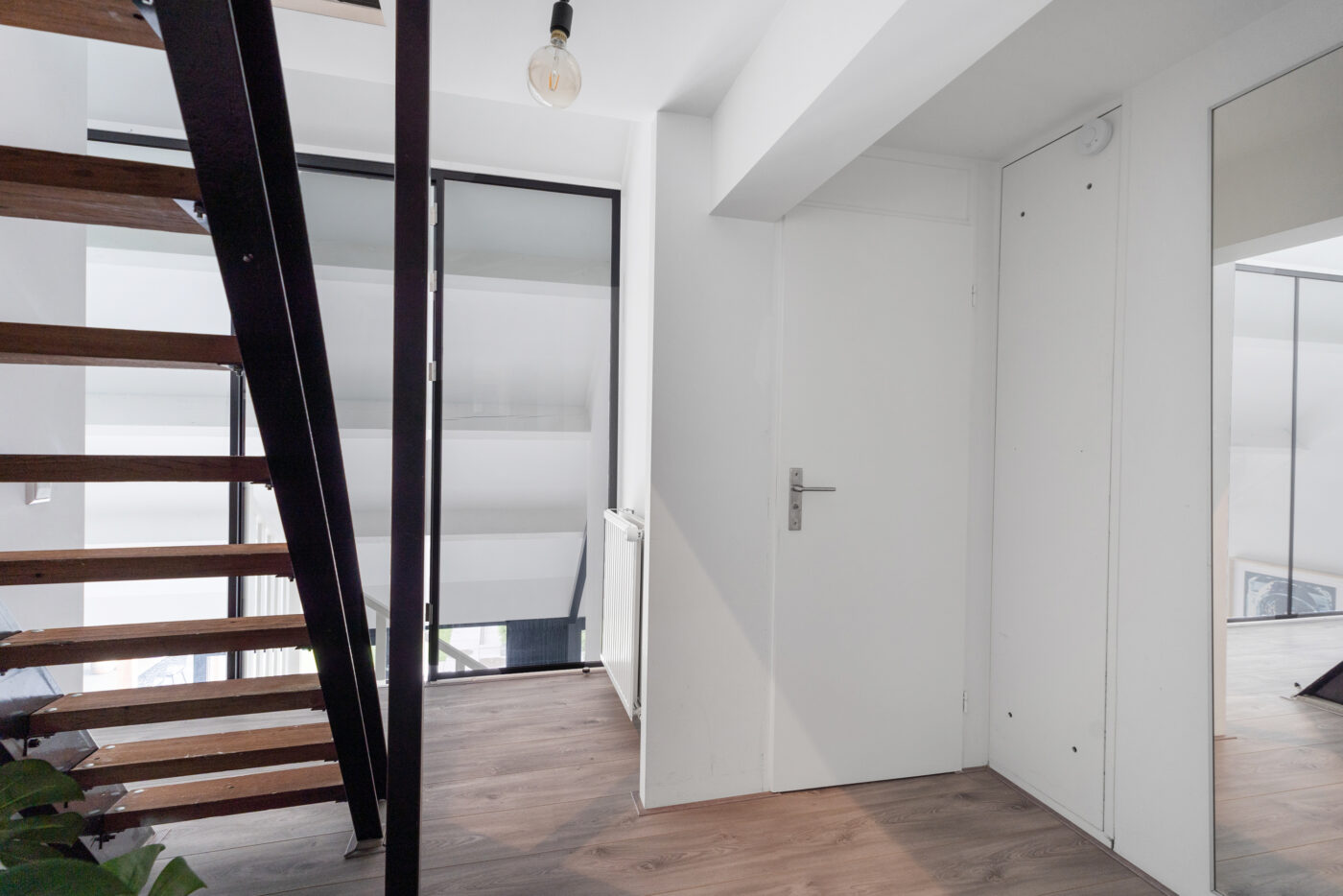 Een glazen pui (vide) zorgt voor een open verbinding met de woonkamer beneden en houdt de warmte goed vast. Hier is een fijne werkplek gecreëerd, ideaal voor thuiswerken. Op deze verdieping bevinden zich twee ruime slaapkamers met airco en rolluiken. De afwerking is van hoog niveau met gestucte wanden, plafonds en een nette laminaatvloer. De moderne badkamer heeft een betonlook afwerking met geïntegreerd ligbad, ruime inloopdouche, wastafelmeubel, vrijhangend toilet, designradiator en een dakraam voor daglicht en ventilatie.