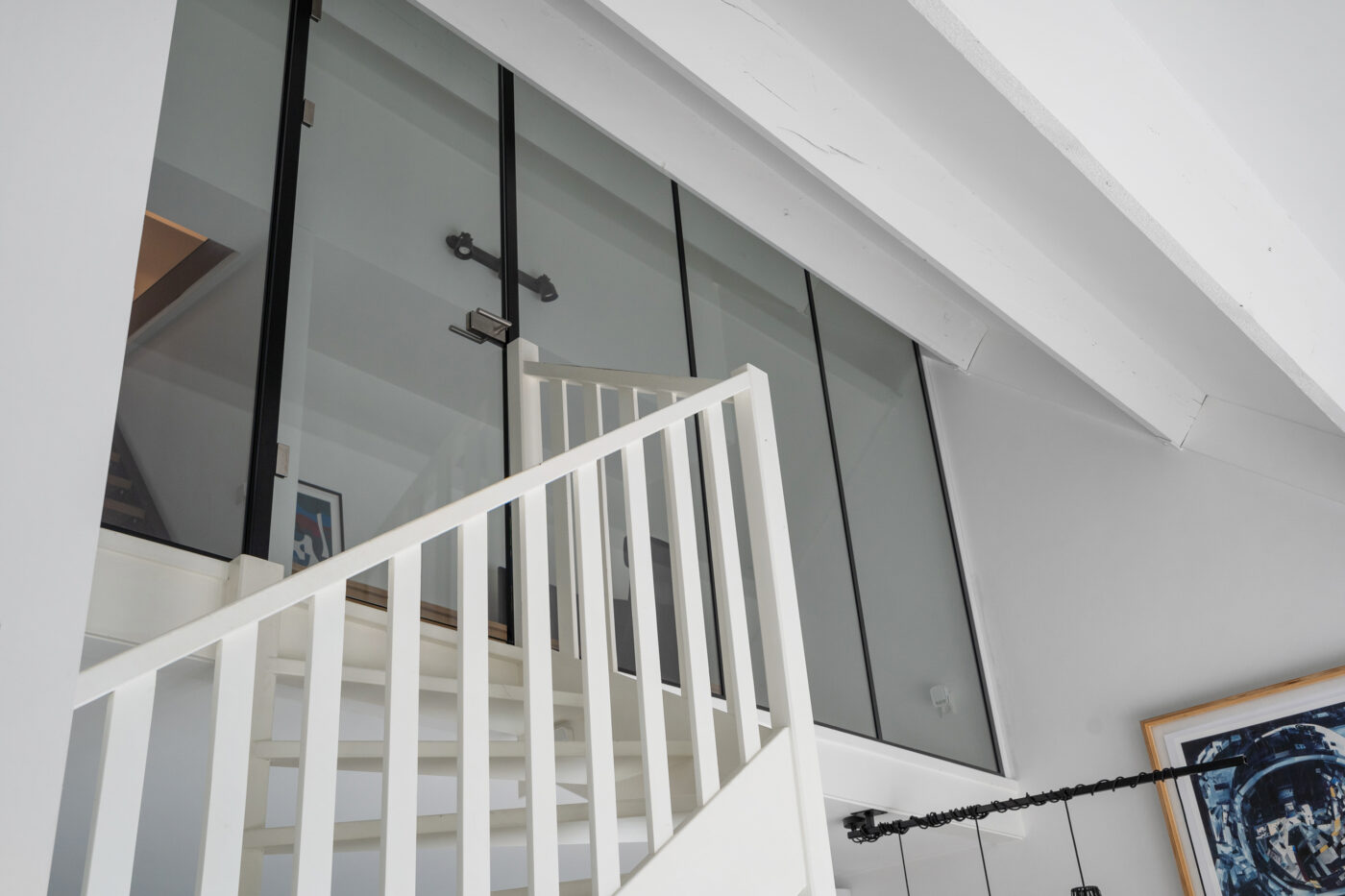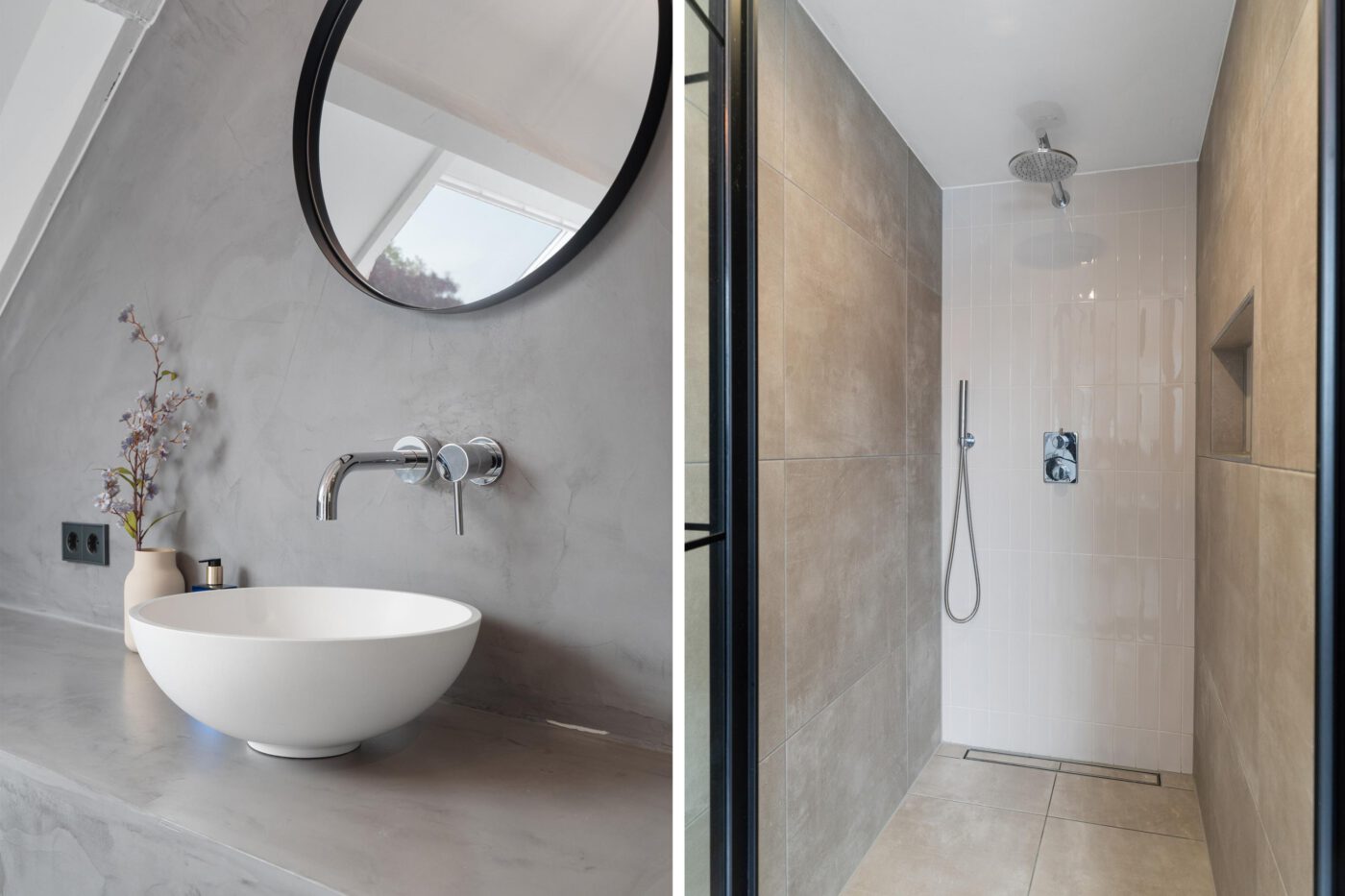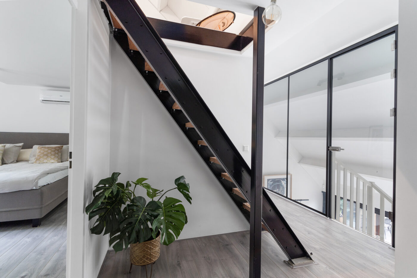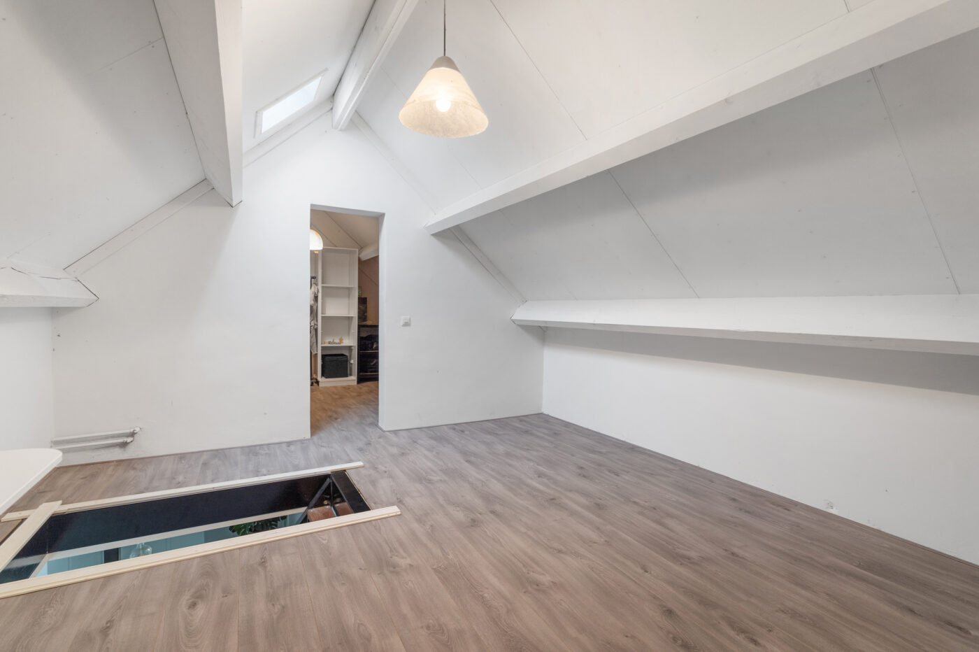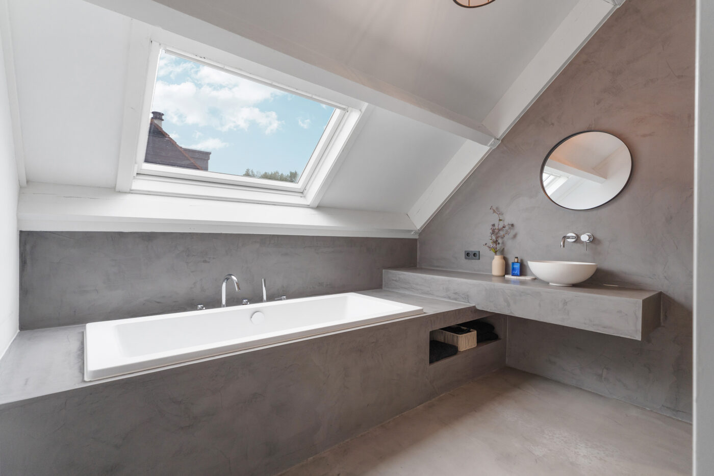 Een glazen pui (vide) zorgt voor een open verbinding met de woonkamer beneden en houdt de warmte goed vast. Hier is een fijne werkplek gecreëerd, ideaal voor thuiswerken. Op deze verdieping bevinden zich twee ruime slaapkamers met airco en rolluiken. De afwerking is van hoog niveau met gestucte wanden, plafonds en een nette laminaatvloer. De moderne badkamer heeft een betonlook afwerking met geïntegreerd ligbad, ruime inloopdouche, wastafelmeubel, vrijhangend toilet, designradiator en een dakraam voor daglicht en ventilatie.