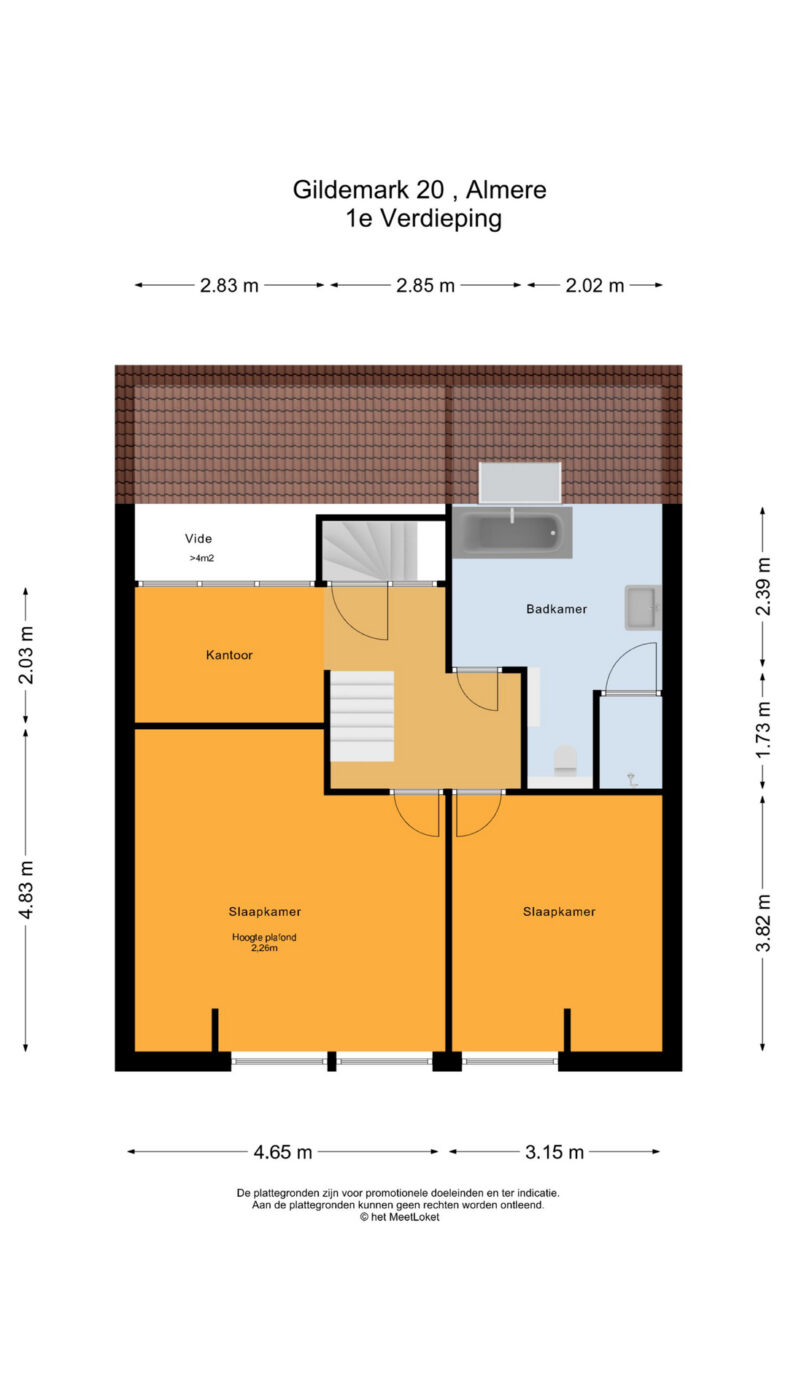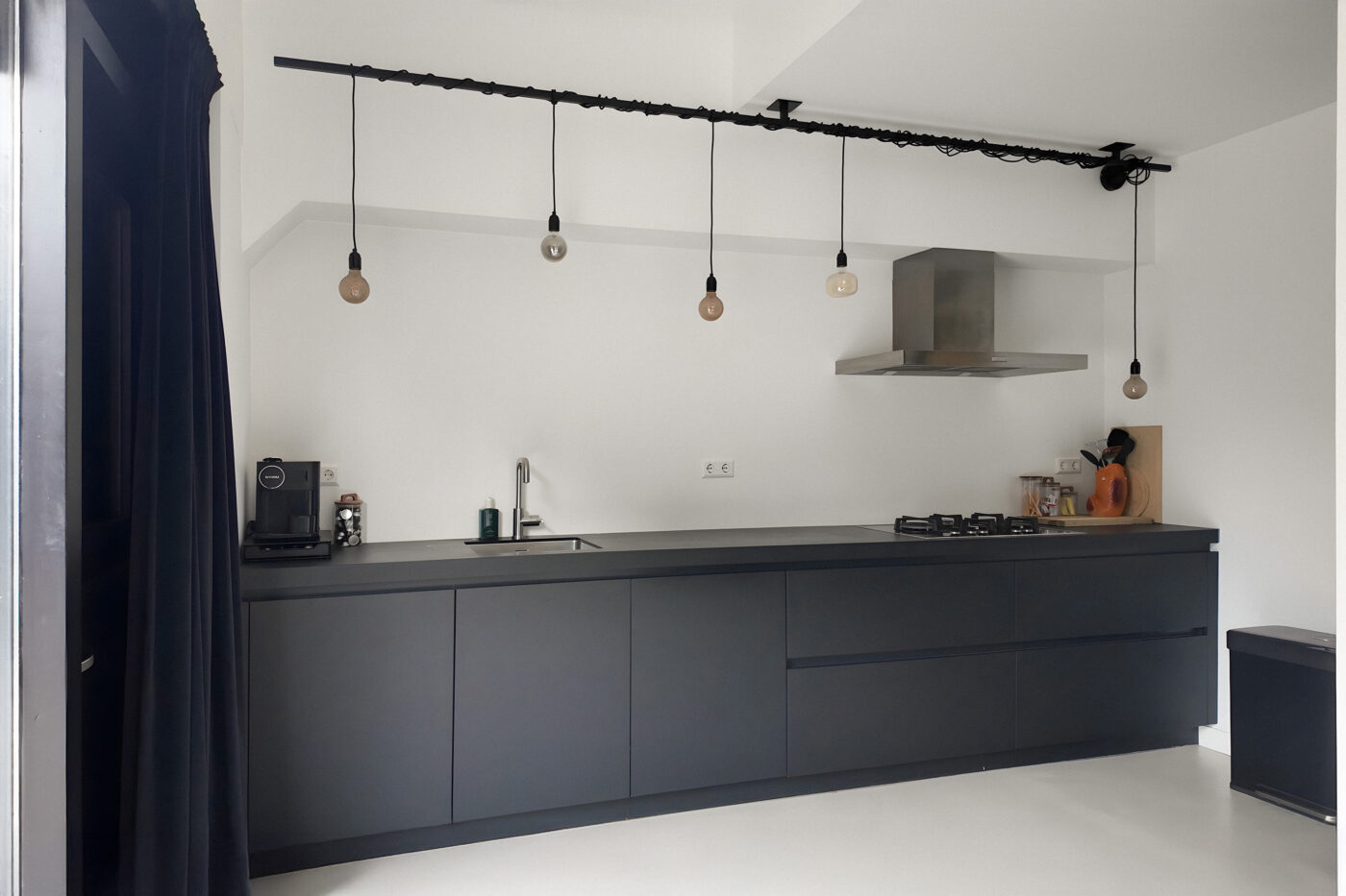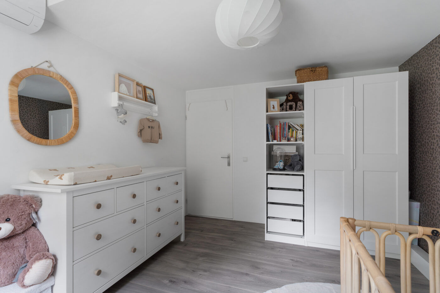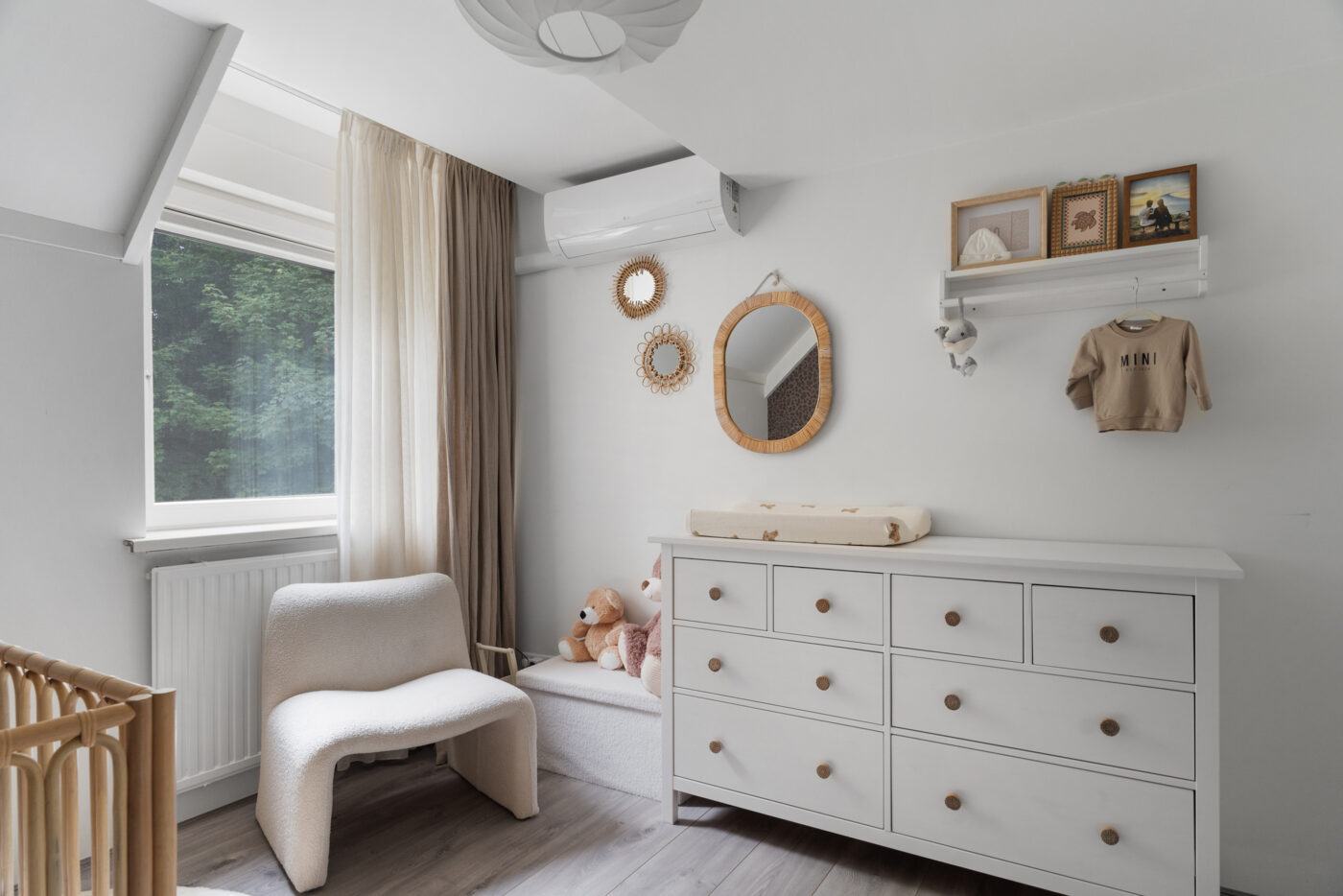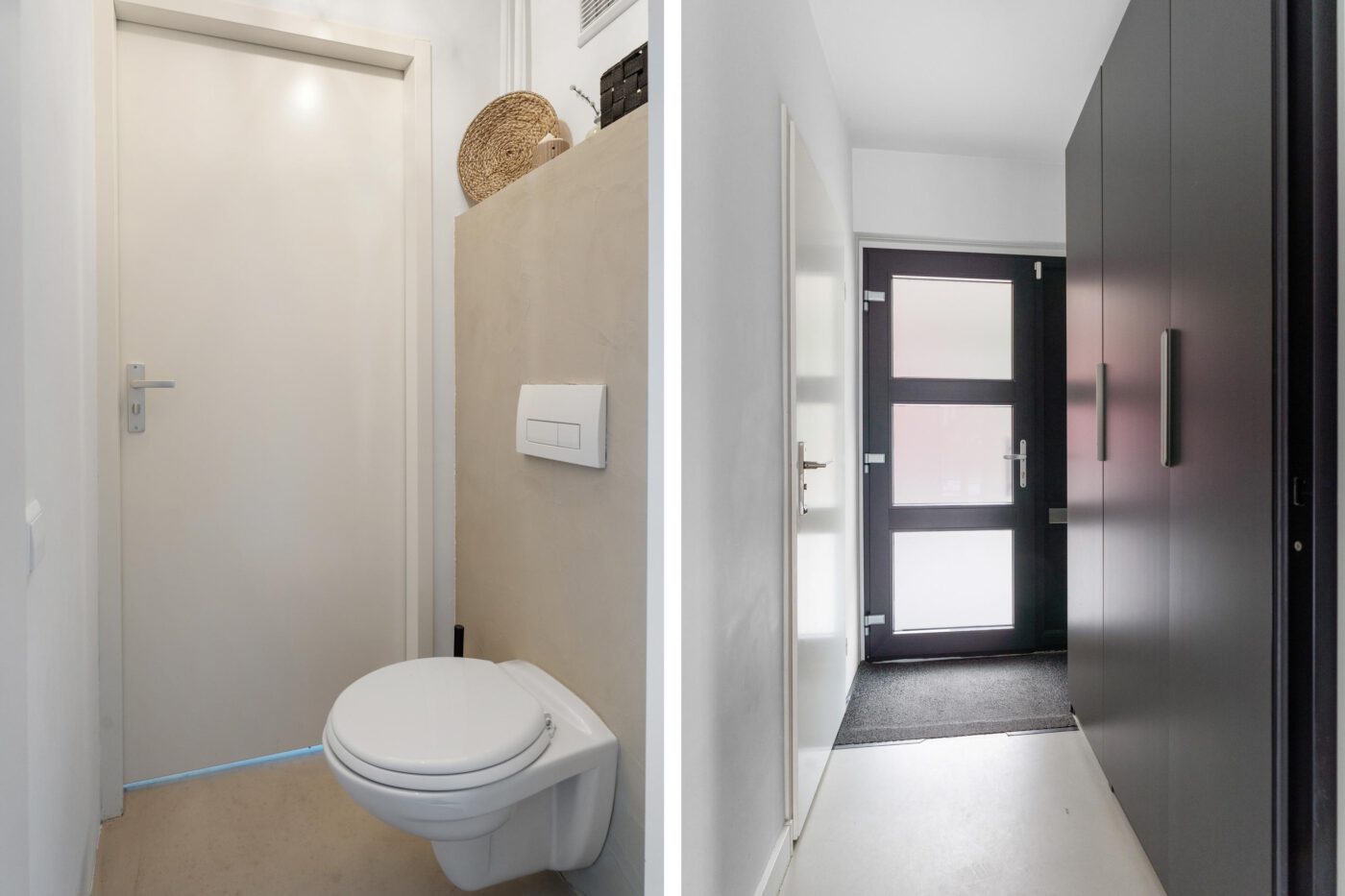 Een glazen pui (vide) zorgt voor een open verbinding met de woonkamer beneden en houdt de warmte goed vast. Hier is een fijne werkplek gecreëerd, ideaal voor thuiswerken. Op deze verdieping bevinden zich twee ruime slaapkamers met airco en rolluiken. De afwerking is van hoog niveau met gestucte wanden, plafonds en een nette laminaatvloer. De moderne badkamer heeft een betonlook afwerking met geïntegreerd ligbad, ruime inloopdouche, wastafelmeubel, vrijhangend toilet, designradiator en een dakraam voor daglicht en ventilatie.