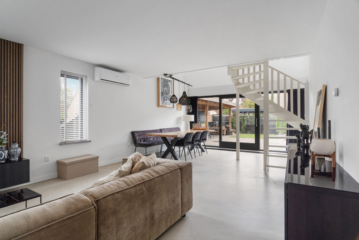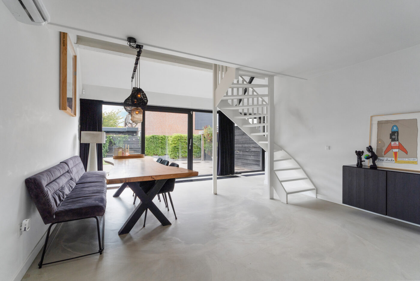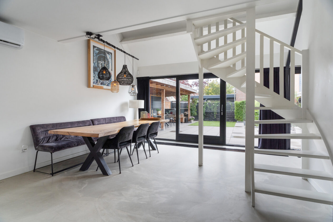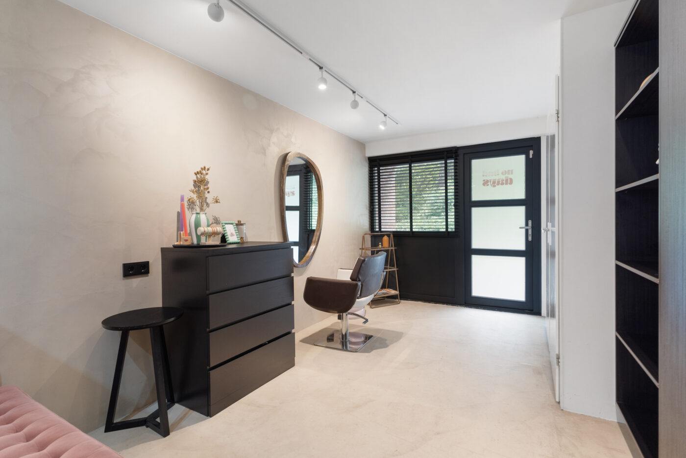 Via de entree met hal, garderobe en toilet kom je door een glazen deur binnen in de ruime woonkamer aan de voorzijde. De begane grond is strak afgewerkt met beton ciré vloeren en gestucte wanden en plafonds, wat zorgt voor een moderne uitstraling. Aan de achterzijde bevindt zich het eetgedeelte met de open keuken, voorzien van een 5-pits gaskookplaat, vaatwasser, combi-oven/stoom, koelkast en vriezer. Aansluitend ligt een extra ruimte die nu in gebruik is als kapperssalon, maar ook geschikt is als slaapkamer met badkamer, praktijkruimte of kantoor. Tevens is er een binnenberging aanwezig.