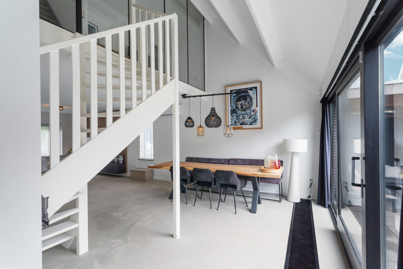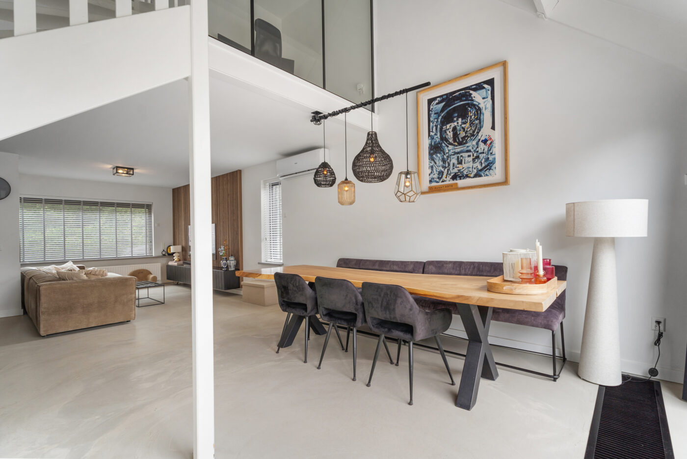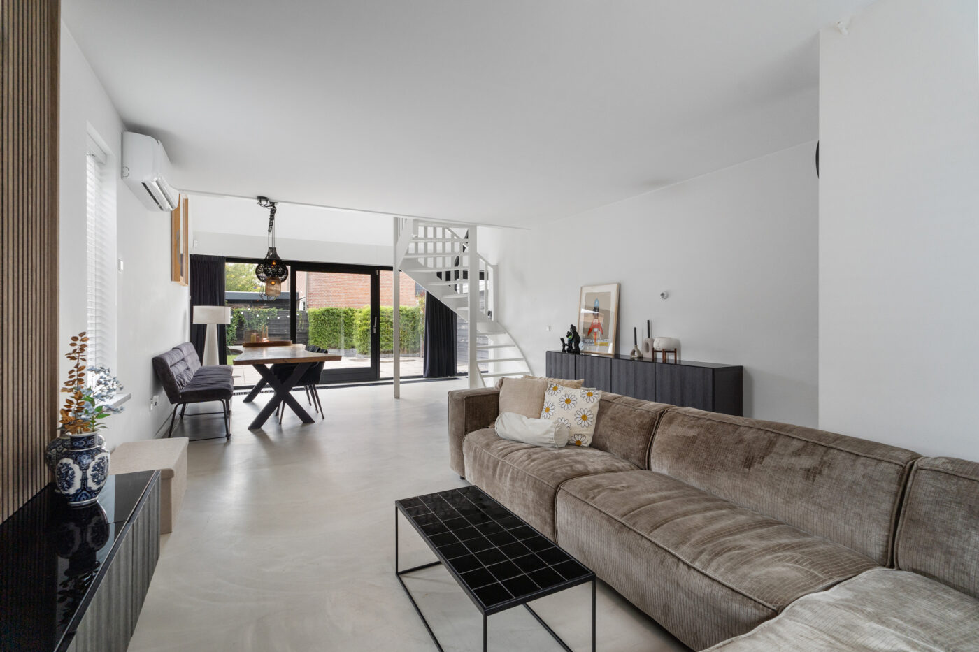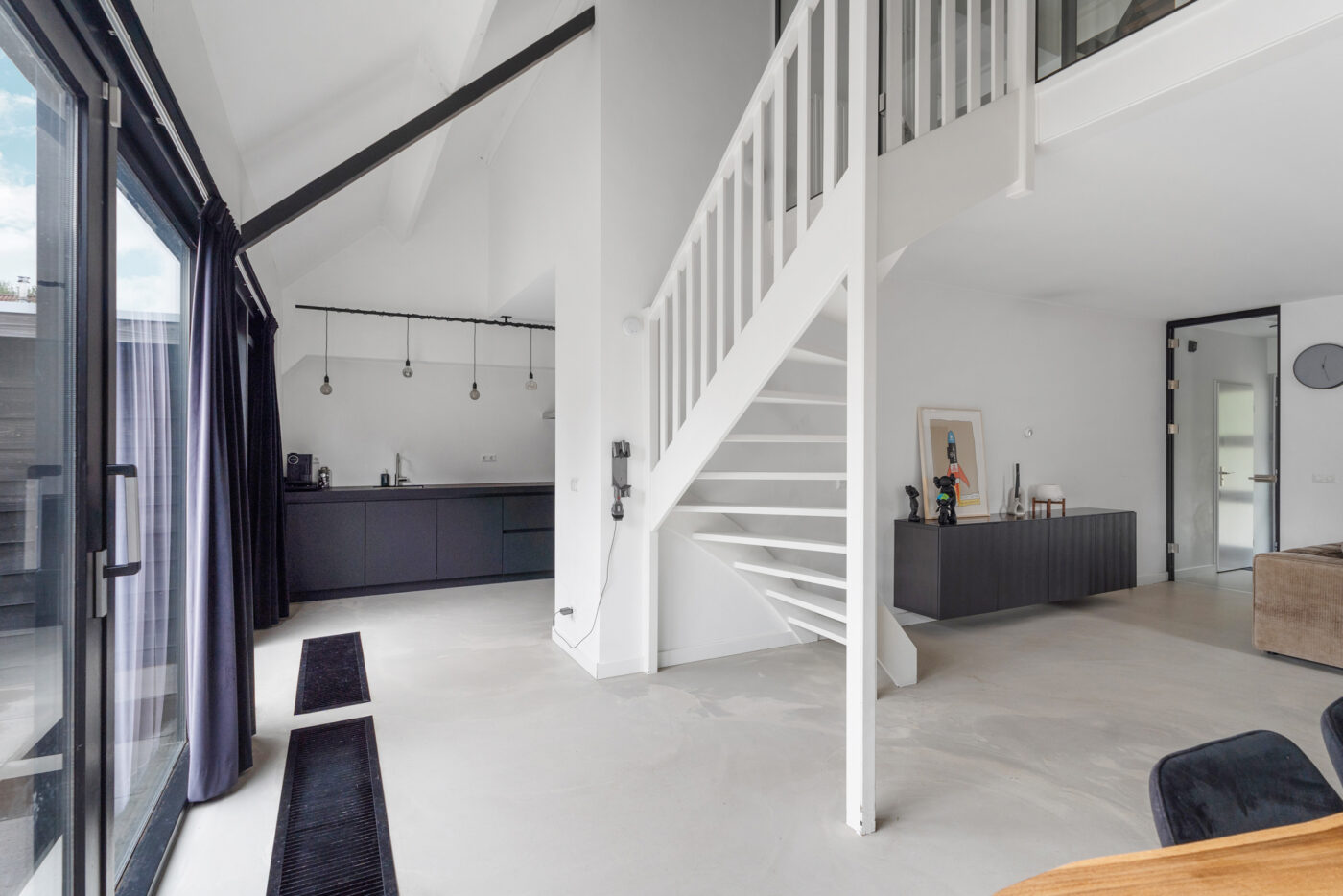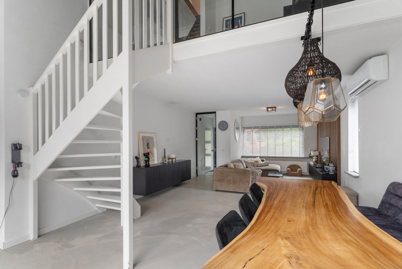 Via de entree met hal, garderobe en toilet kom je door een glazen deur binnen in de ruime woonkamer aan de voorzijde. De begane grond is strak afgewerkt met beton ciré vloeren en gestucte wanden en plafonds, wat zorgt voor een moderne uitstraling. Aan de achterzijde bevindt zich het eetgedeelte met de open keuken, voorzien van een 5-pits gaskookplaat, vaatwasser, combi-oven/stoom, koelkast en vriezer. Aansluitend ligt een extra ruimte die nu in gebruik is als kapperssalon, maar ook geschikt is als slaapkamer met badkamer, praktijkruimte of kantoor. Tevens is er een binnenberging aanwezig.