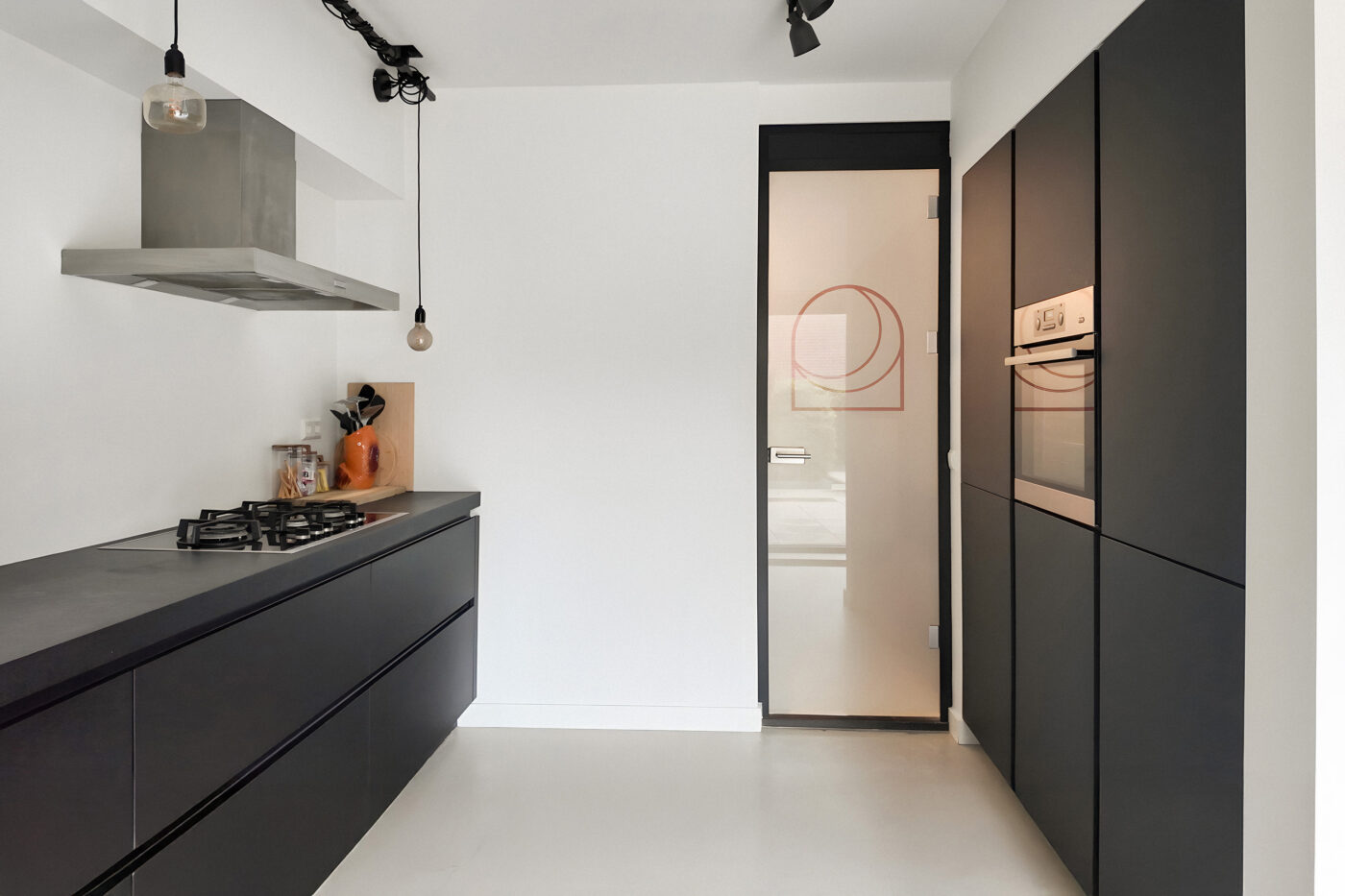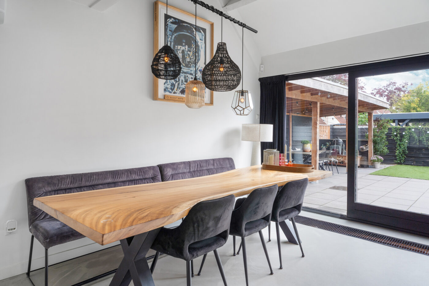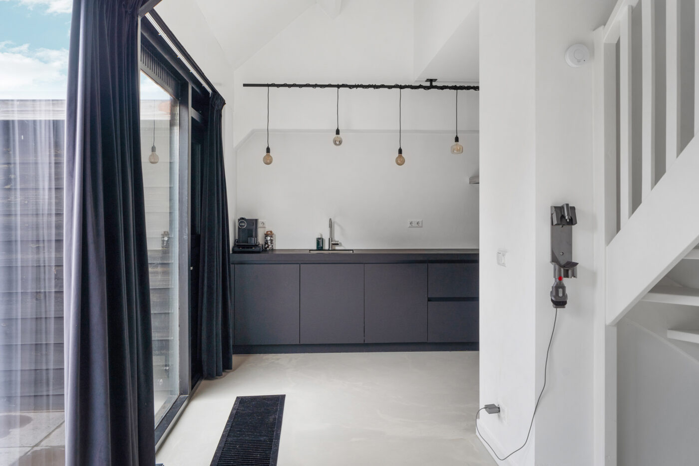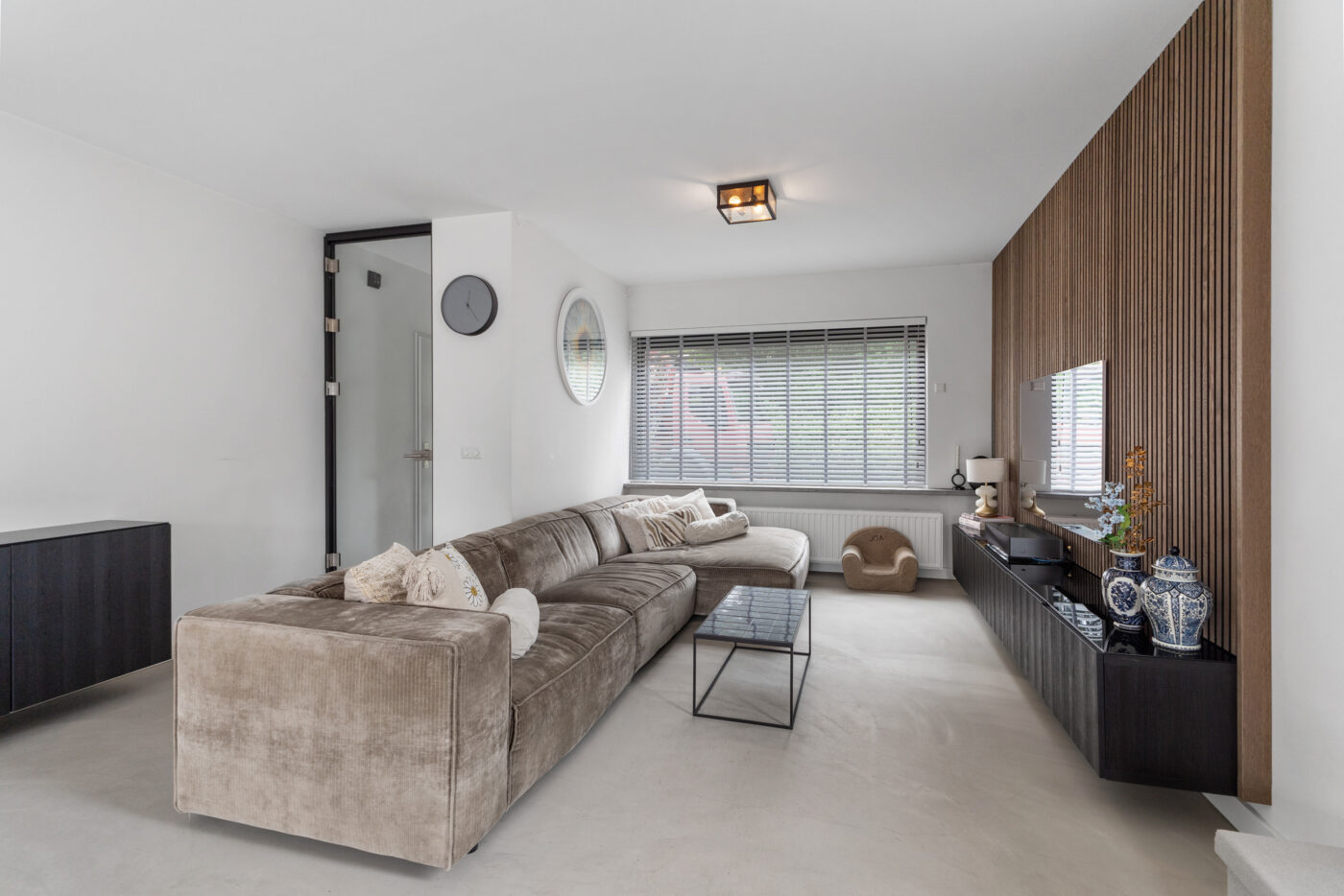 Via de entree met hal, garderobe en toilet kom je door een glazen deur binnen in de ruime woonkamer aan de voorzijde. De begane grond is strak afgewerkt met beton ciré vloeren en gestucte wanden en plafonds, wat zorgt voor een moderne uitstraling. Aan de achterzijde bevindt zich het eetgedeelte met de open keuken, voorzien van een 5-pits gaskookplaat, vaatwasser, combi-oven/stoom, koelkast en vriezer. Aansluitend ligt een extra ruimte die nu in gebruik is als kapperssalon, maar ook geschikt is als slaapkamer met badkamer, praktijkruimte of kantoor. Tevens is er een binnenberging aanwezig.