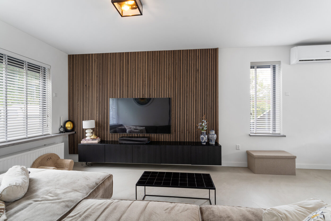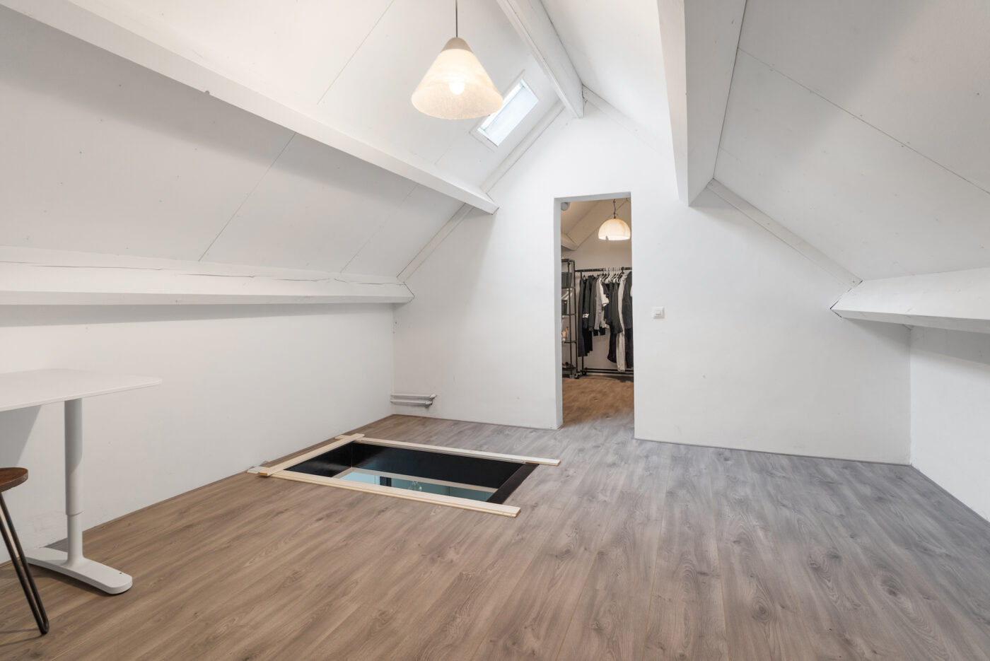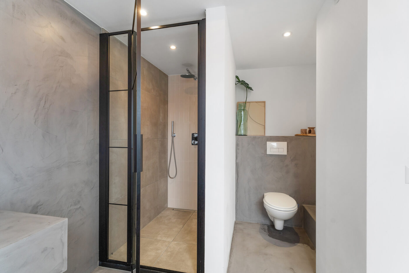 A glass wall (loft) provides an open connection to the living room below and retains heat well. This creates a pleasant workspace, ideal for working from home. This floor also features two spacious bedrooms with air conditioning and shutters. The finish is high-quality, with plastered walls and ceilings and neat laminate flooring. The modern bathroom features a concrete-look finish with an integrated bathtub, spacious walk-in shower, vanity, wall-hung toilet, designer radiator, and a skylight for natural light and ventilation.