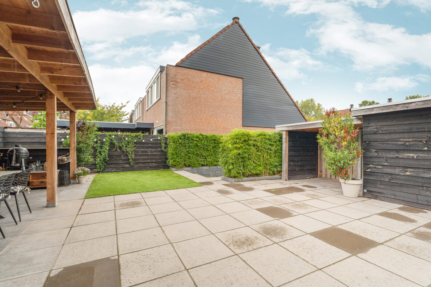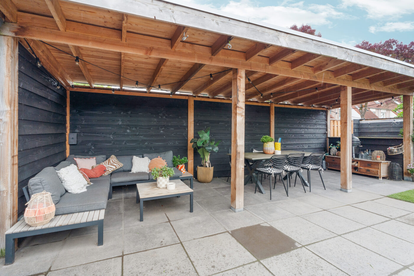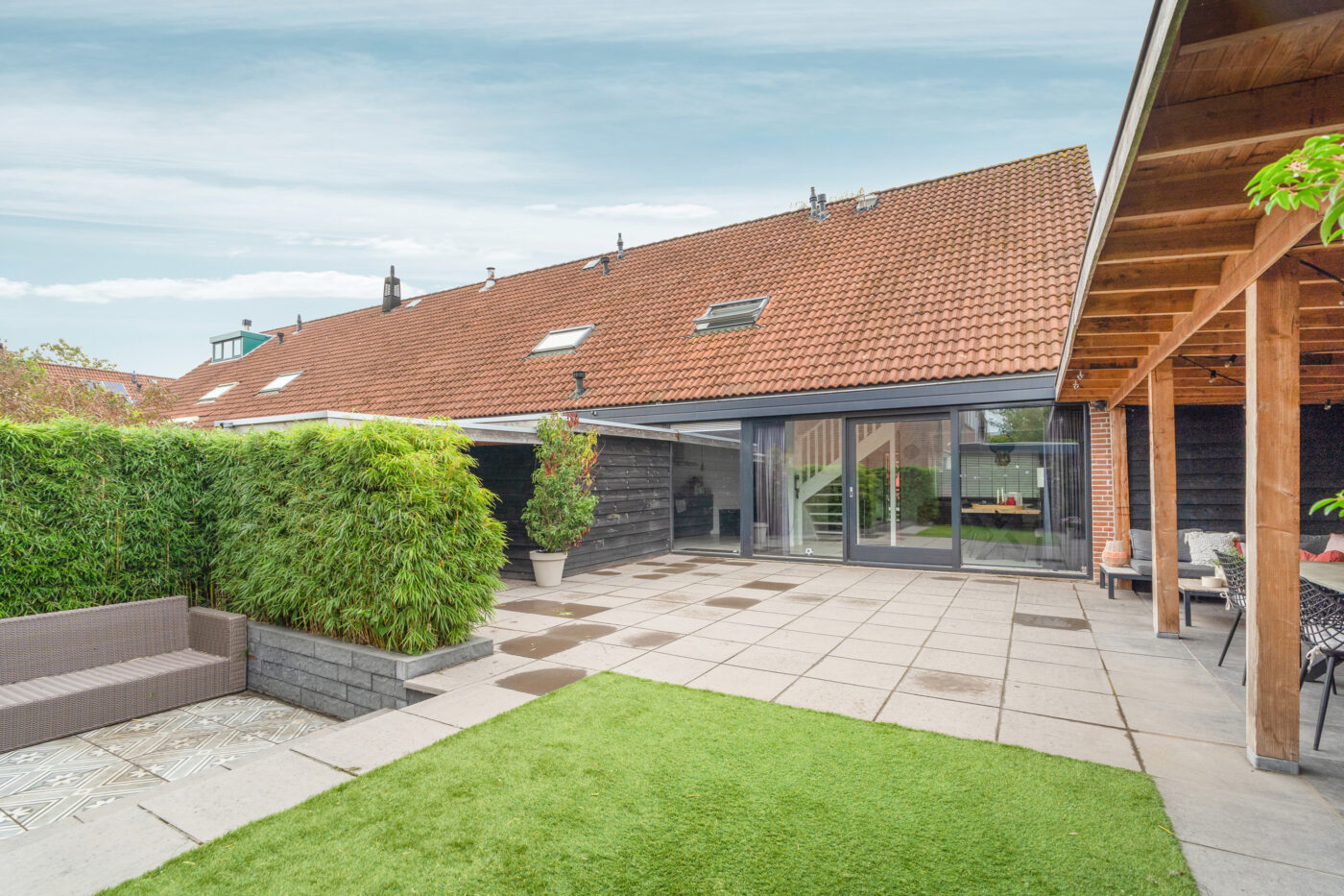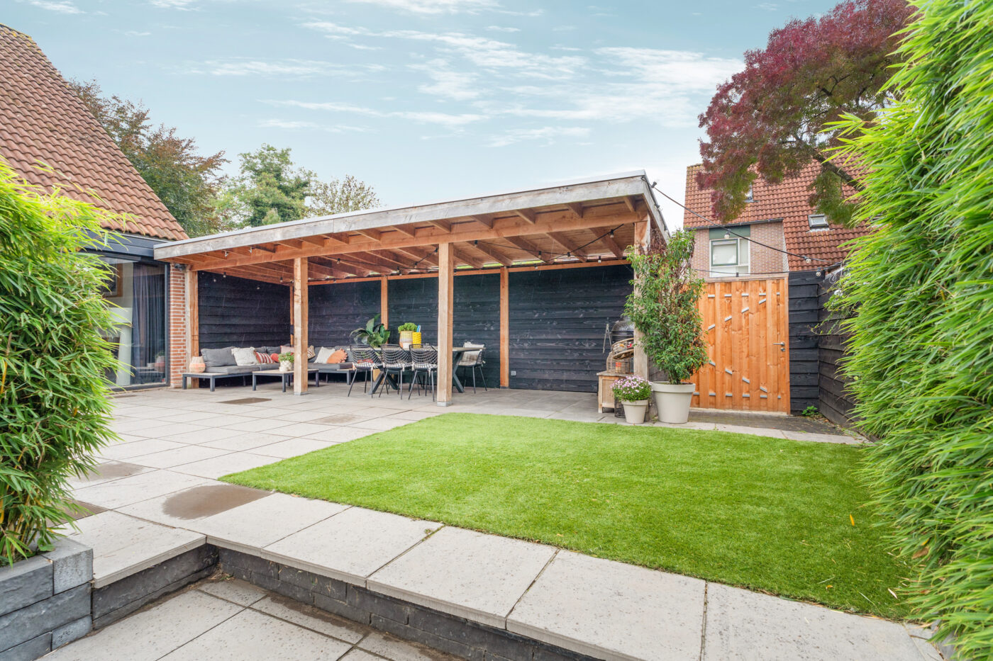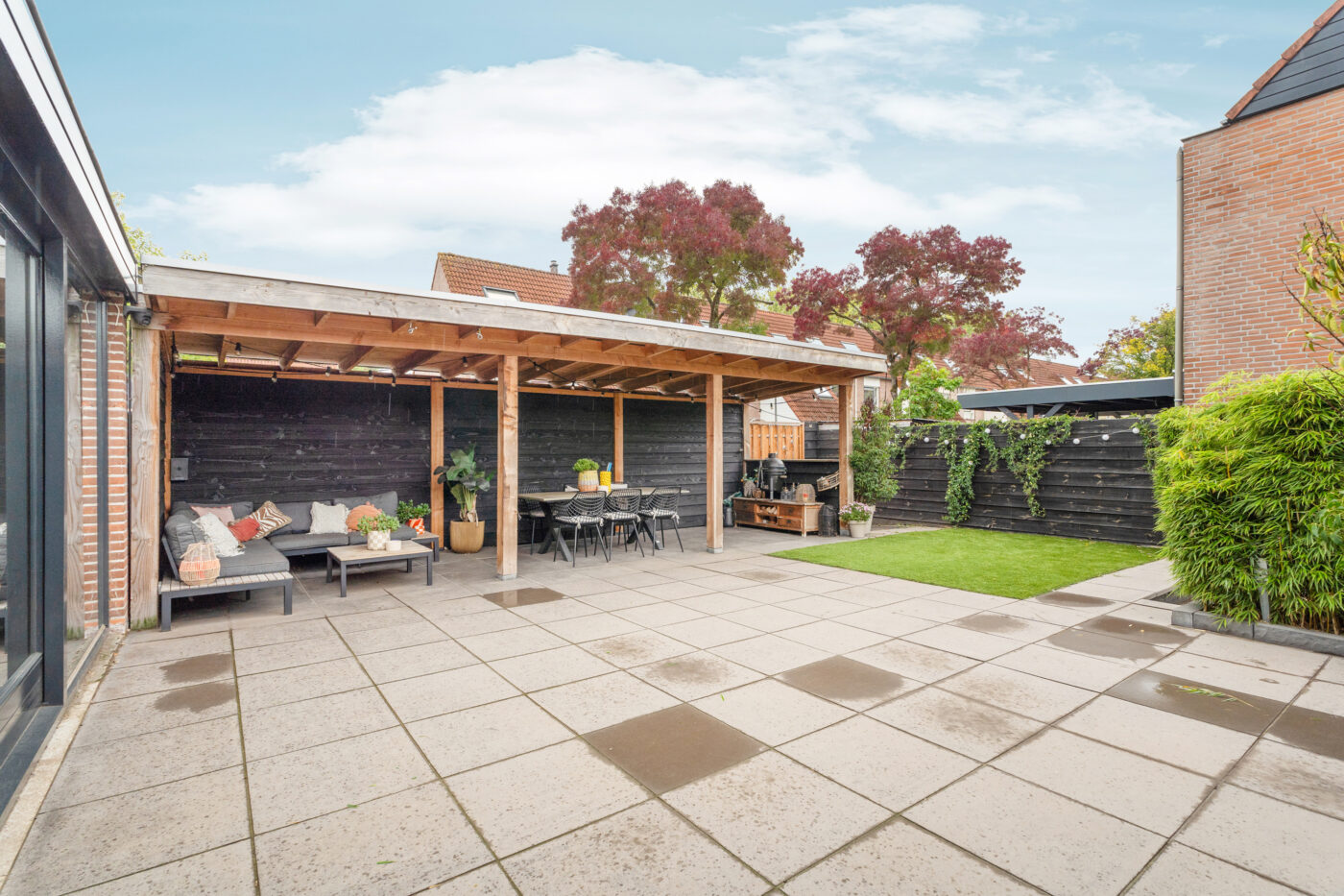 De diepe achtertuin ligt op het noordwesten en biedt de hele dag zon. De tuin is professioneel aangelegd met een sfeervolle combinatie van hout, groen en steen en heeft meerdere zitgedeeltes. De overkapping maakt het mogelijk om ook bij regen of felle zon buiten te genieten.