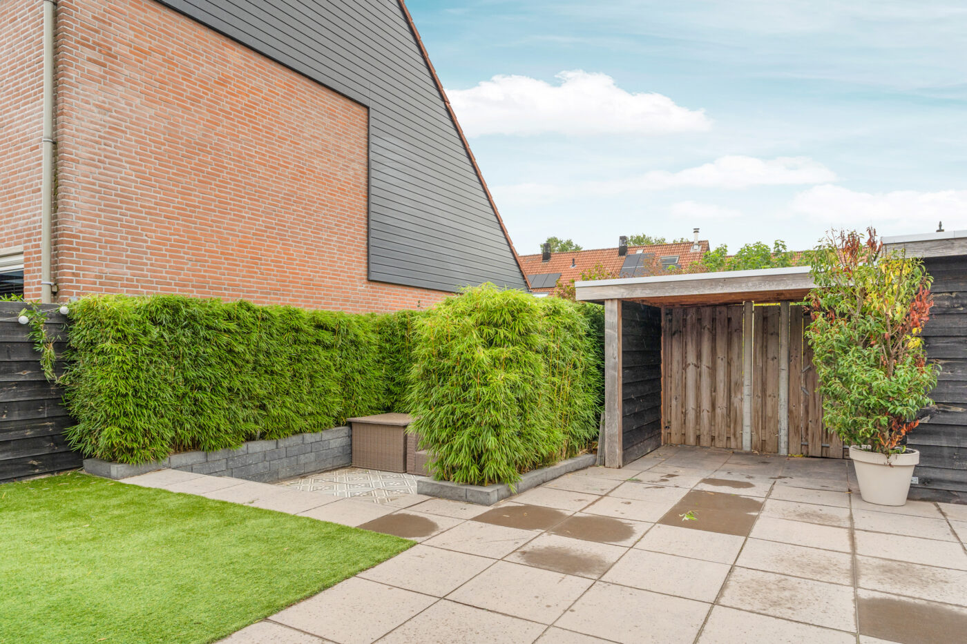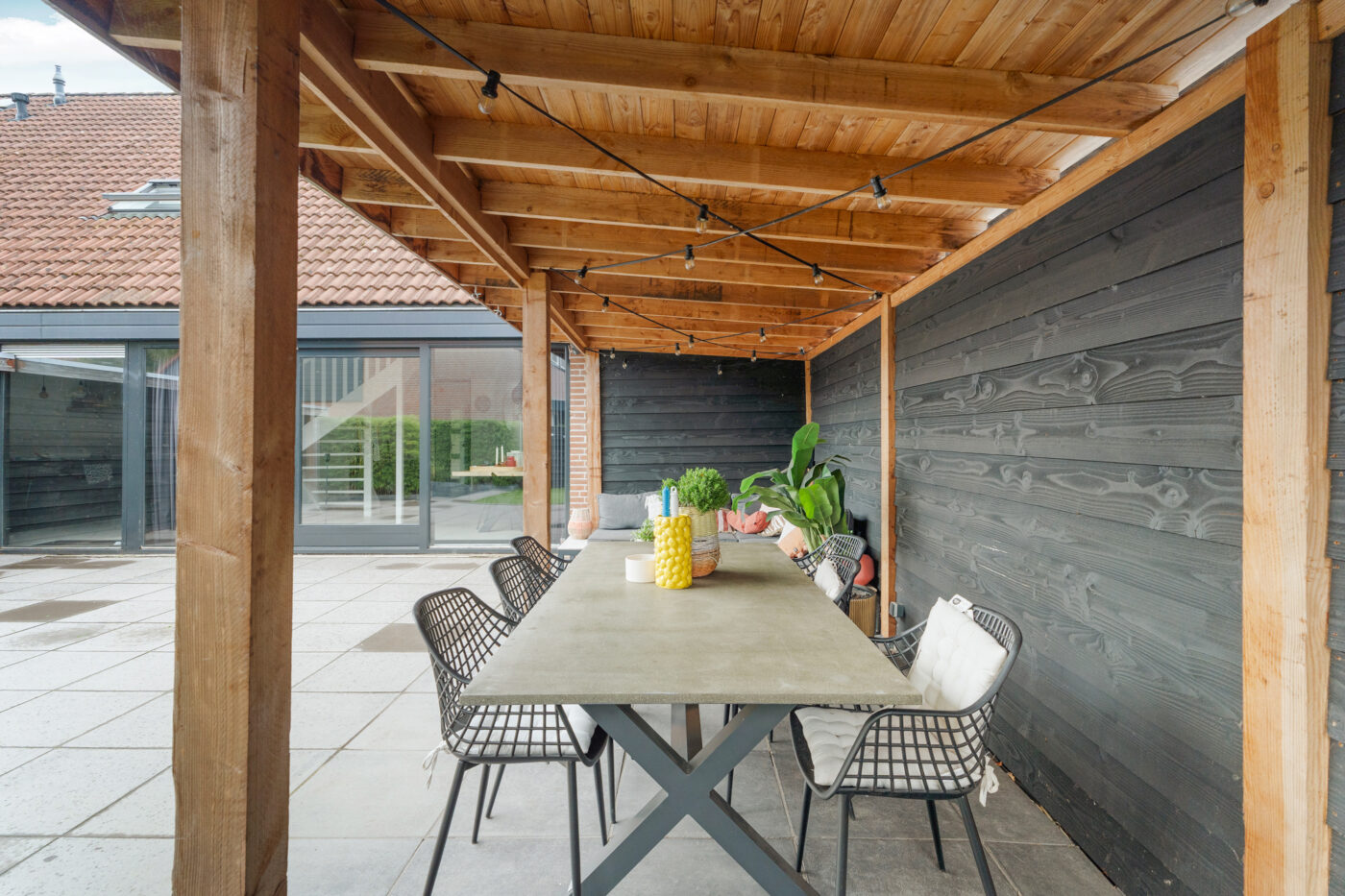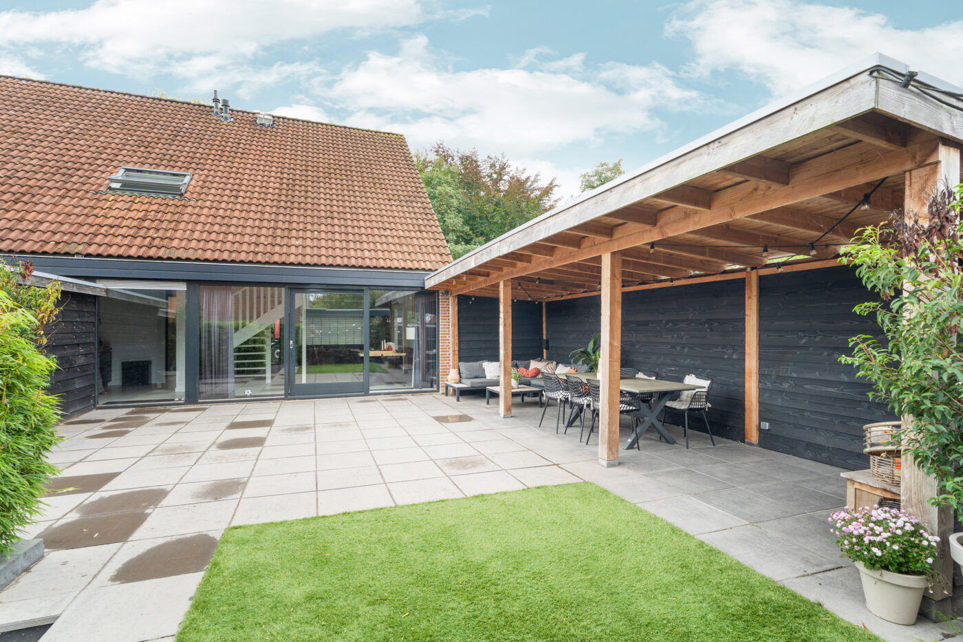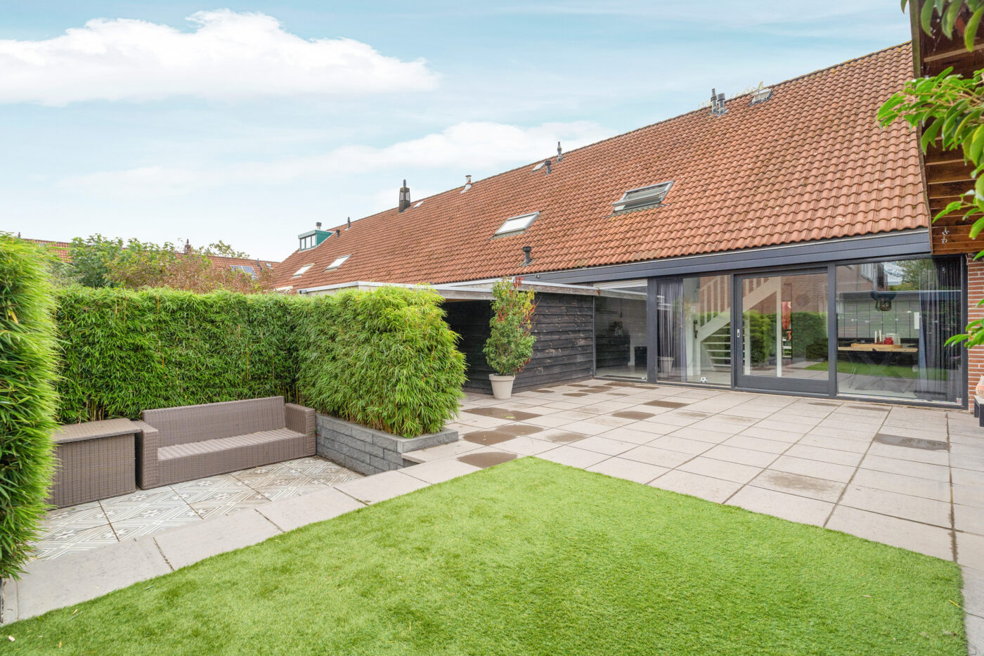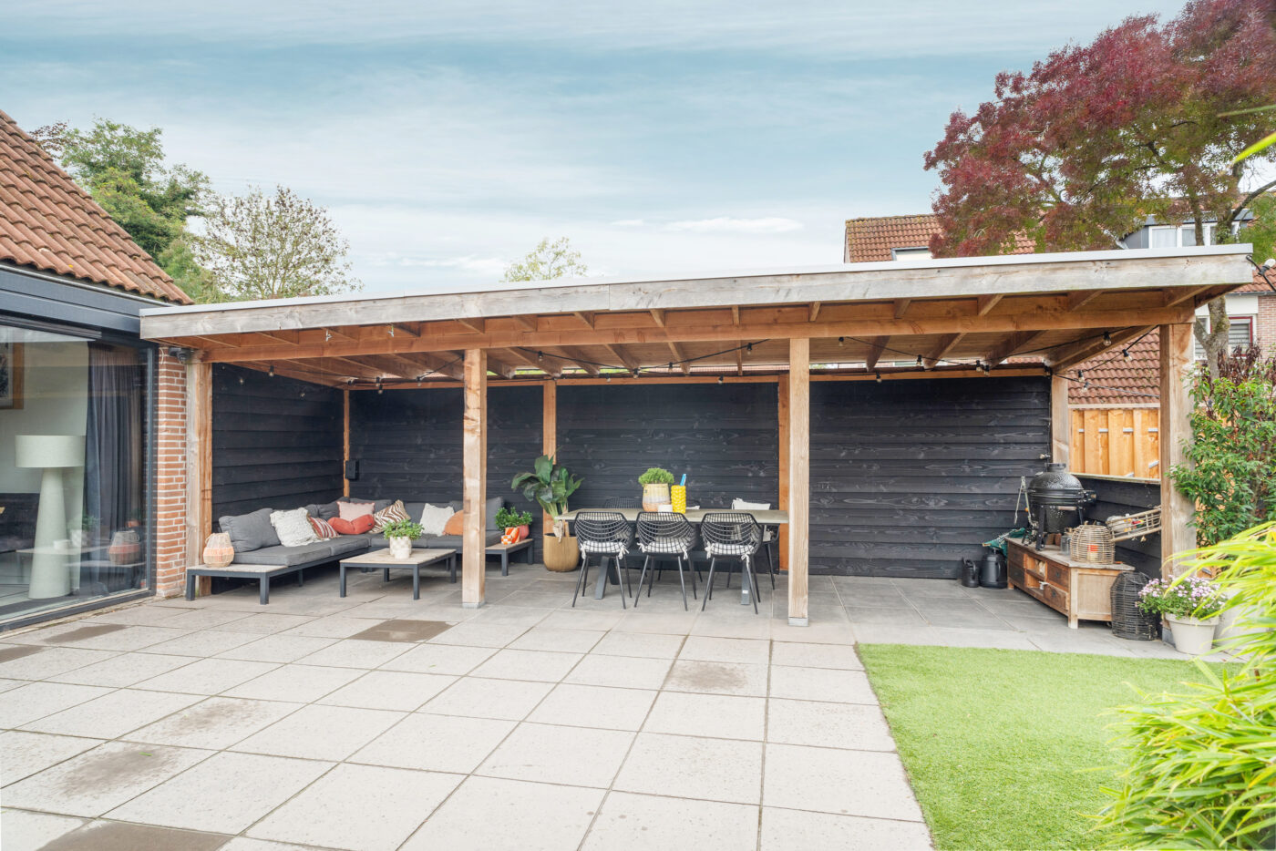 De diepe achtertuin ligt op het noordwesten en biedt de hele dag zon. De tuin is professioneel aangelegd met een sfeervolle combinatie van hout, groen en steen en heeft meerdere zitgedeeltes. De overkapping maakt het mogelijk om ook bij regen of felle zon buiten te genieten.