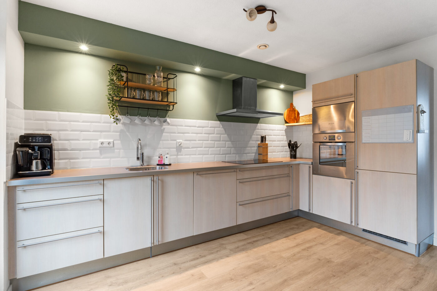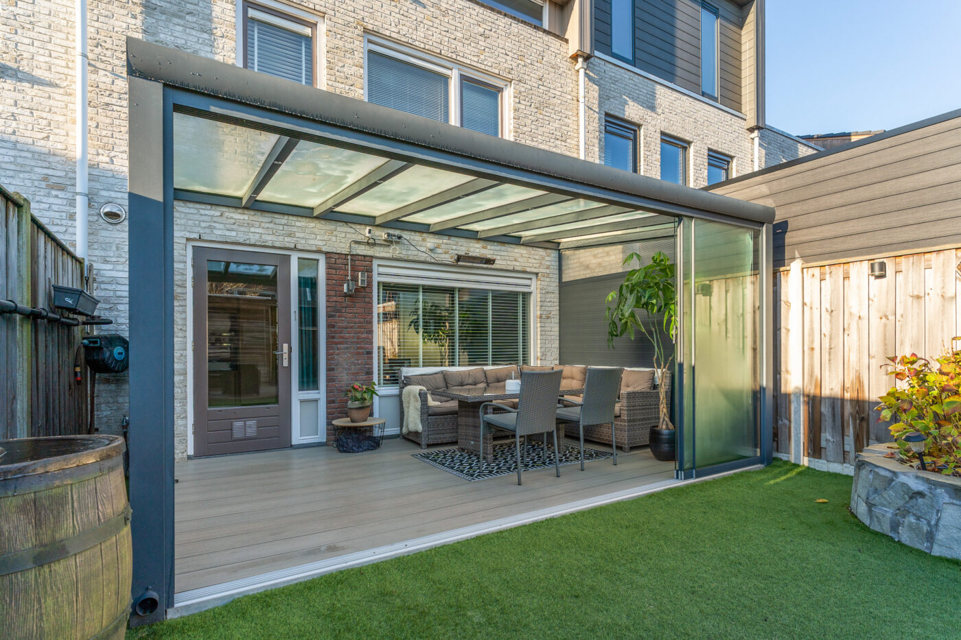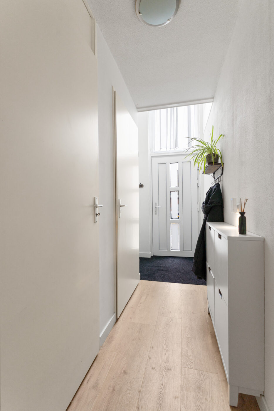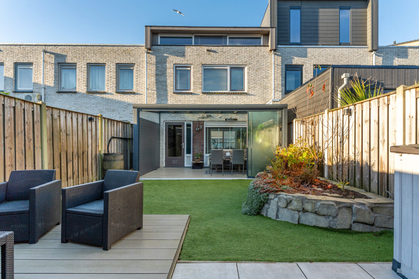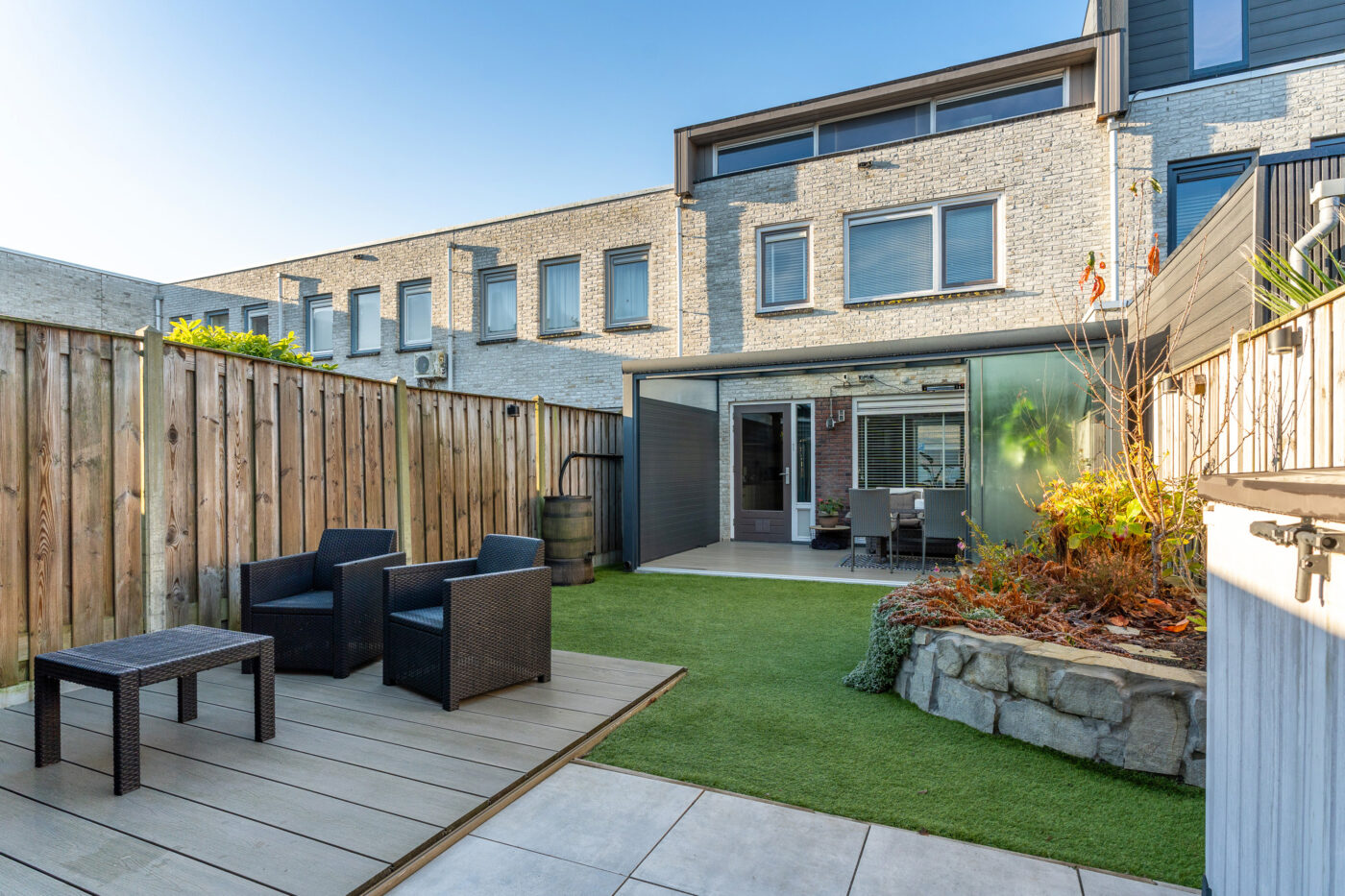 Entrance with meter cupboard, coat closet, beautifully finished toilet, and a stair cupboard for storage. On the ground floor, you enter a charming living room with sleek PVC flooring and floor heating, connected to a fully equipped open-plan kitchen with an induction cooktop, dishwasher, microwave, and a refrigerator/freezer that are still fully functional. The backyard is a picture: low-maintenance, tastefully decorated, with a spacious storage room and a glass veranda with heater and lighting. Here you can enjoy the outdoors the whole year long.