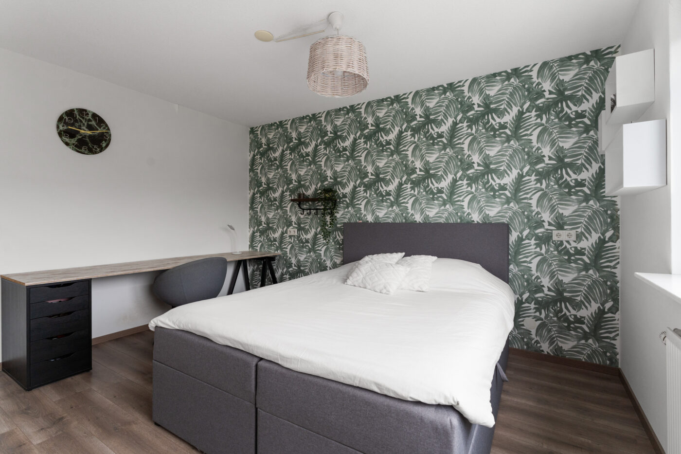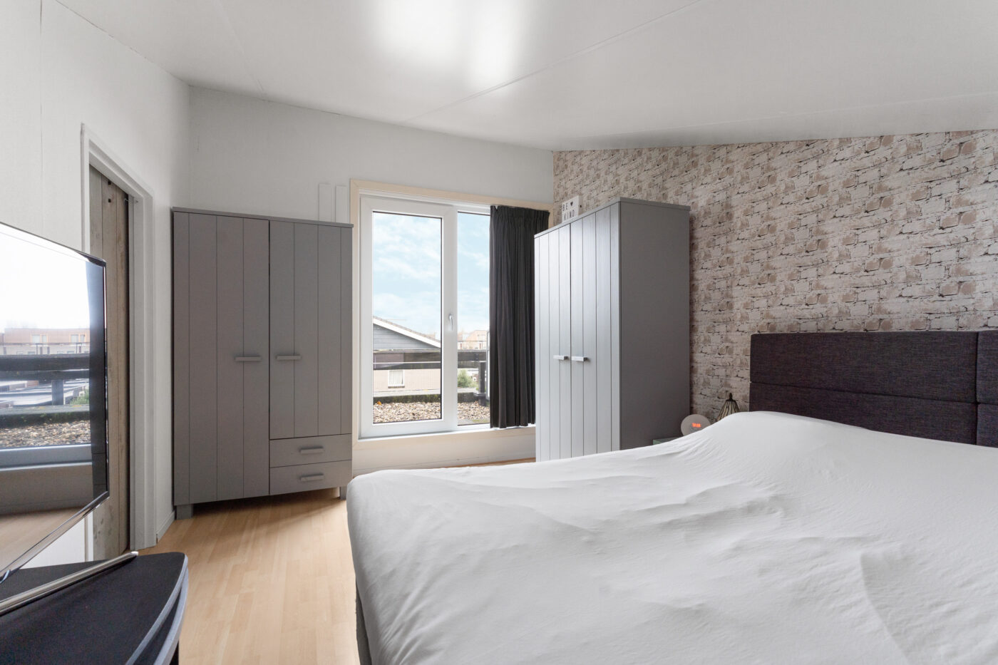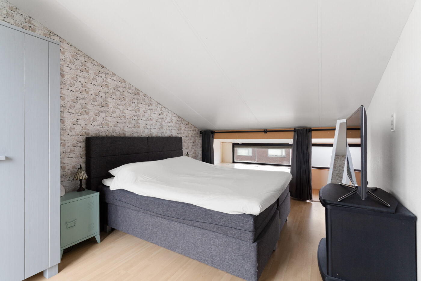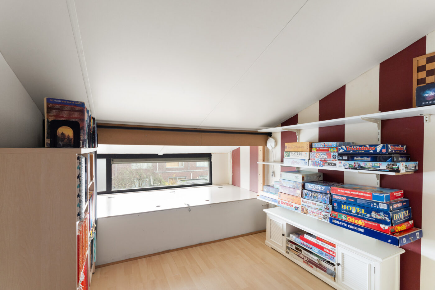 De tweede verdieping is een heerlijke plek om je terug te trekken: een slaapkamer met schuifdeur, veel bergruimte, een speels schuin plafond en een zonnig terras op het zuiden.