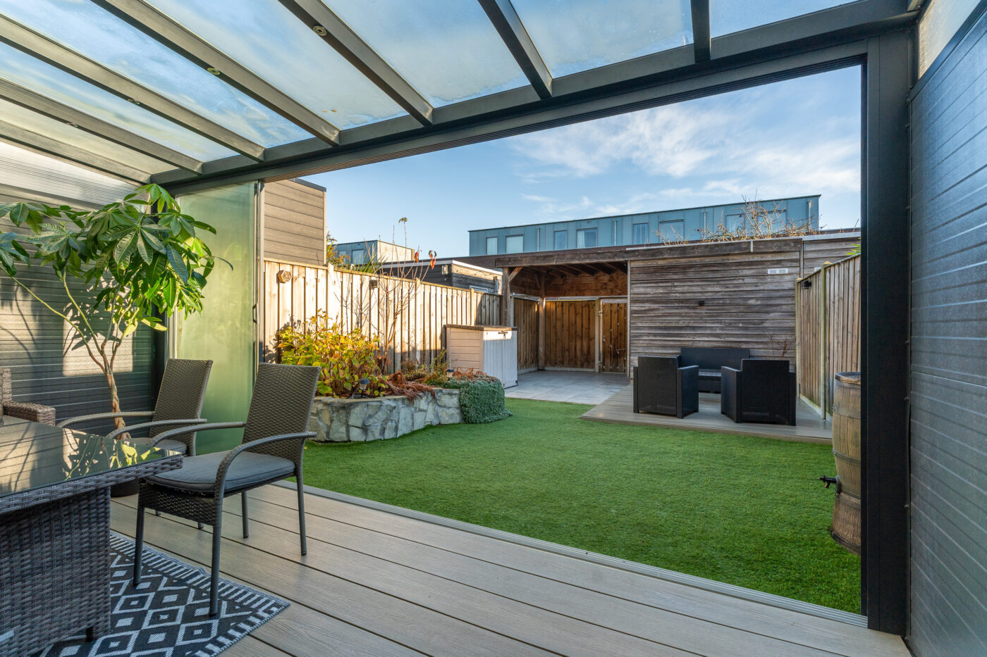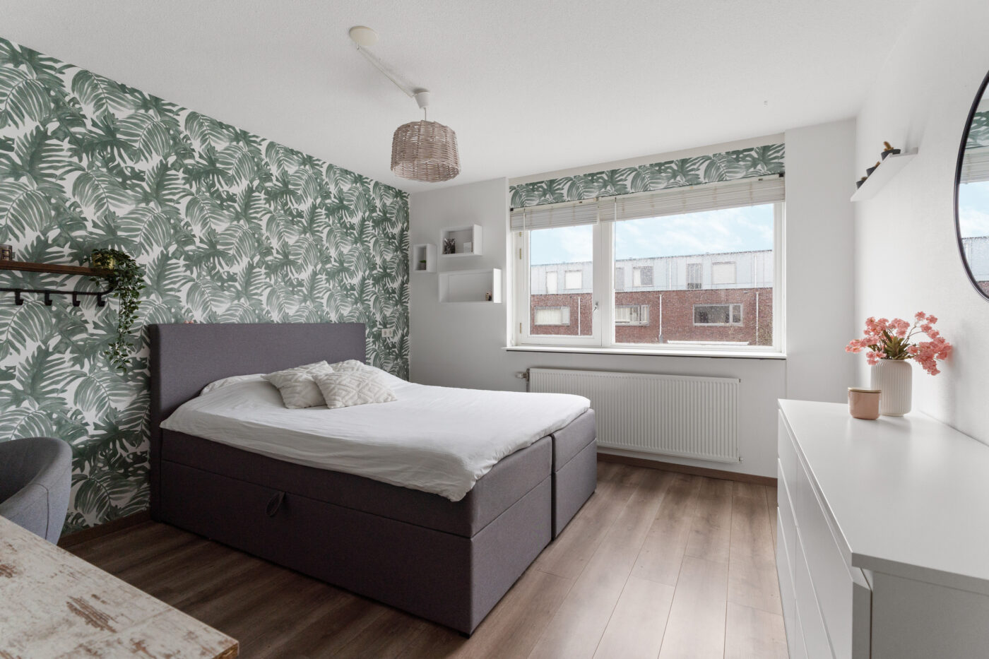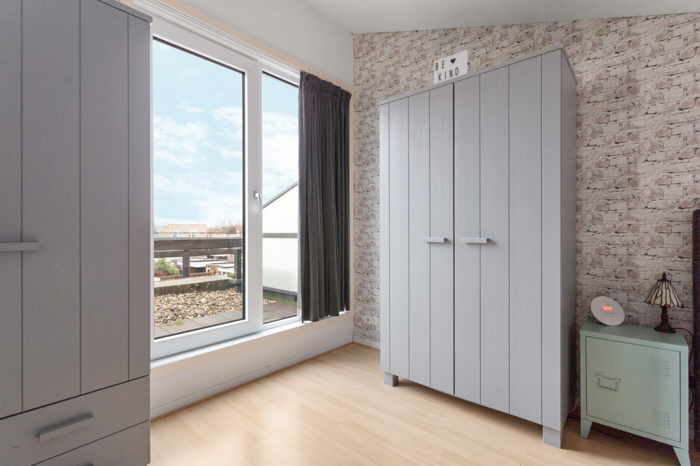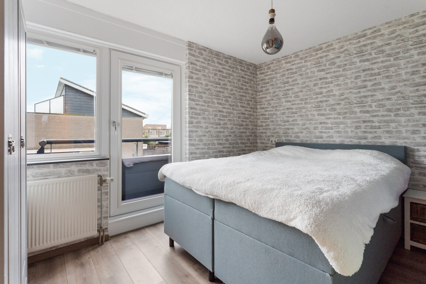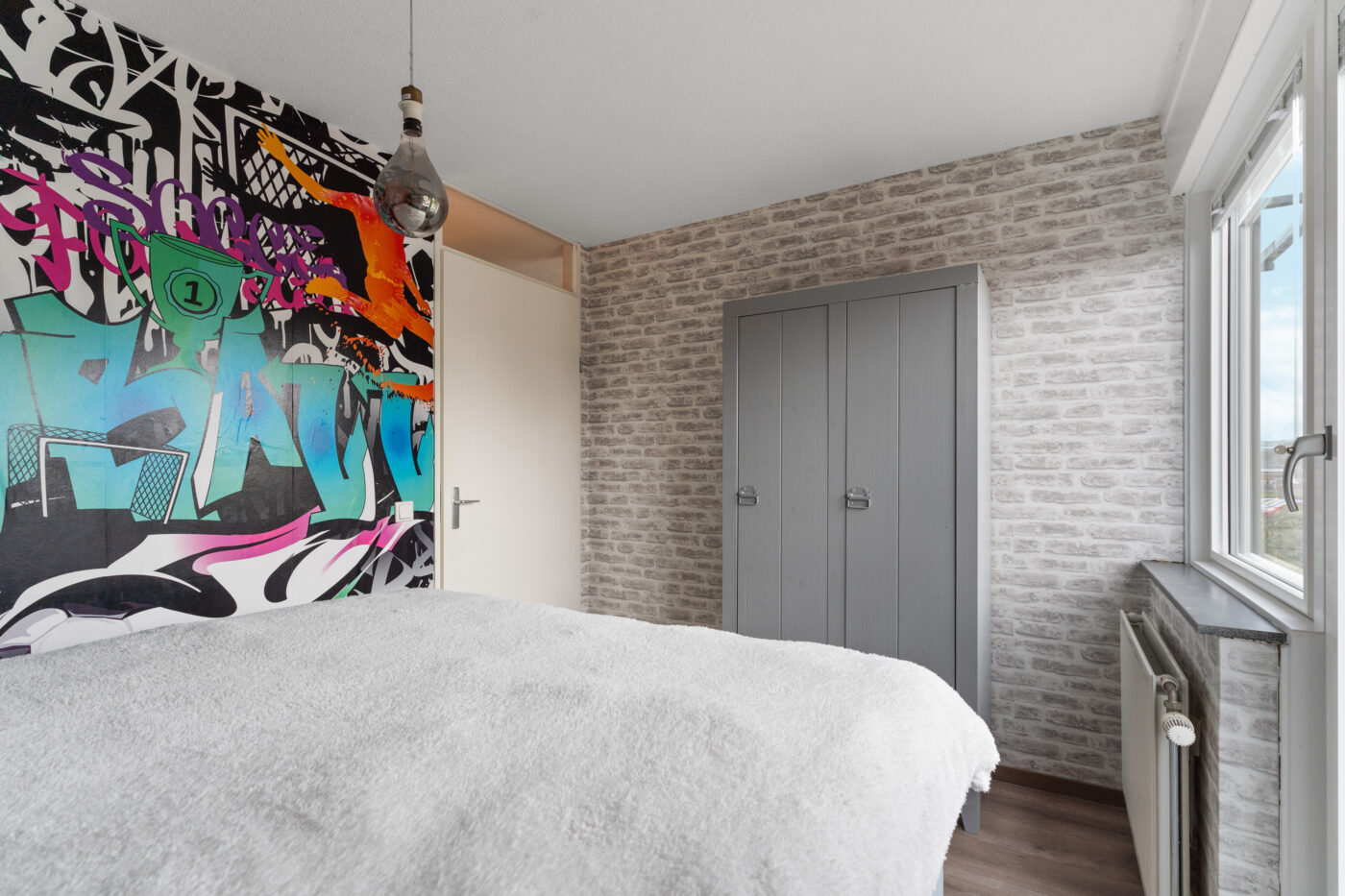 De tweede verdieping is een heerlijke plek om je terug te trekken: een slaapkamer met schuifdeur, veel bergruimte, een speels schuin plafond en een zonnig terras op het zuiden.