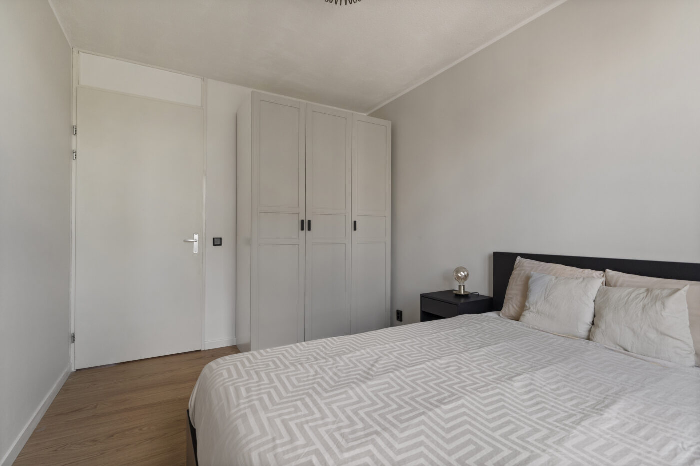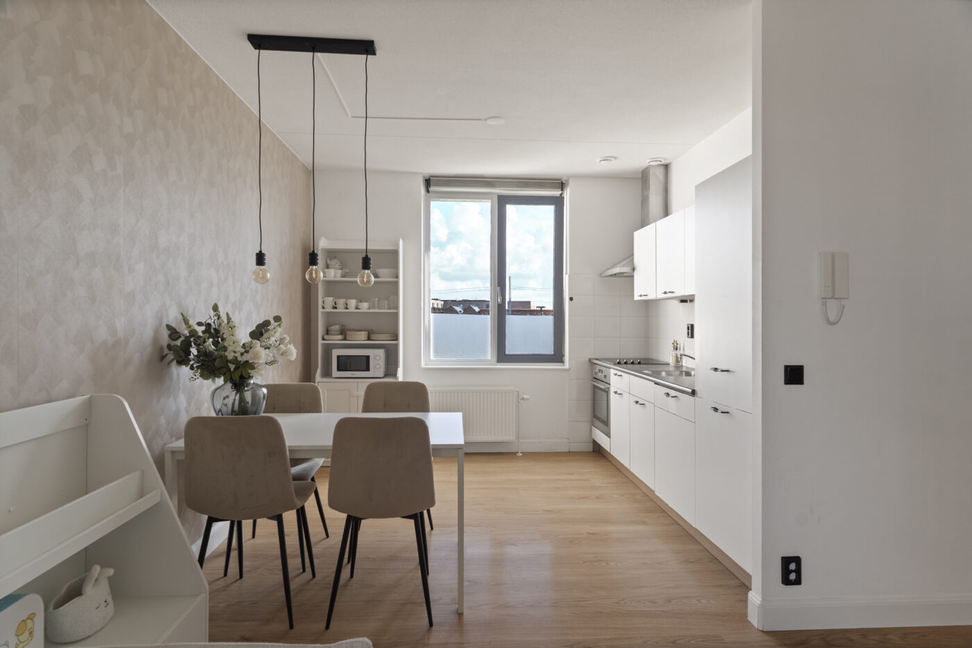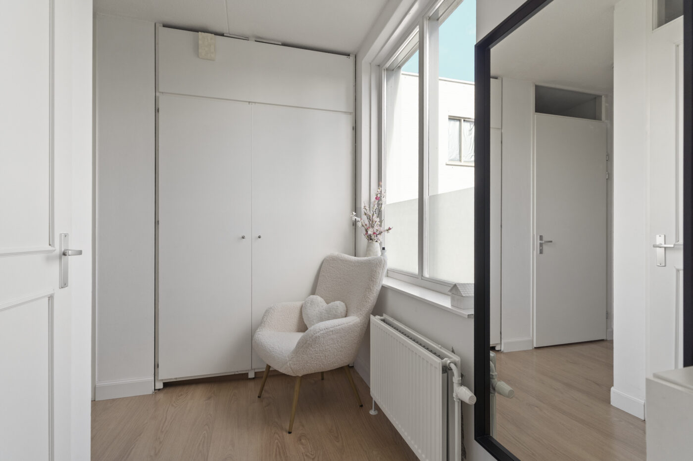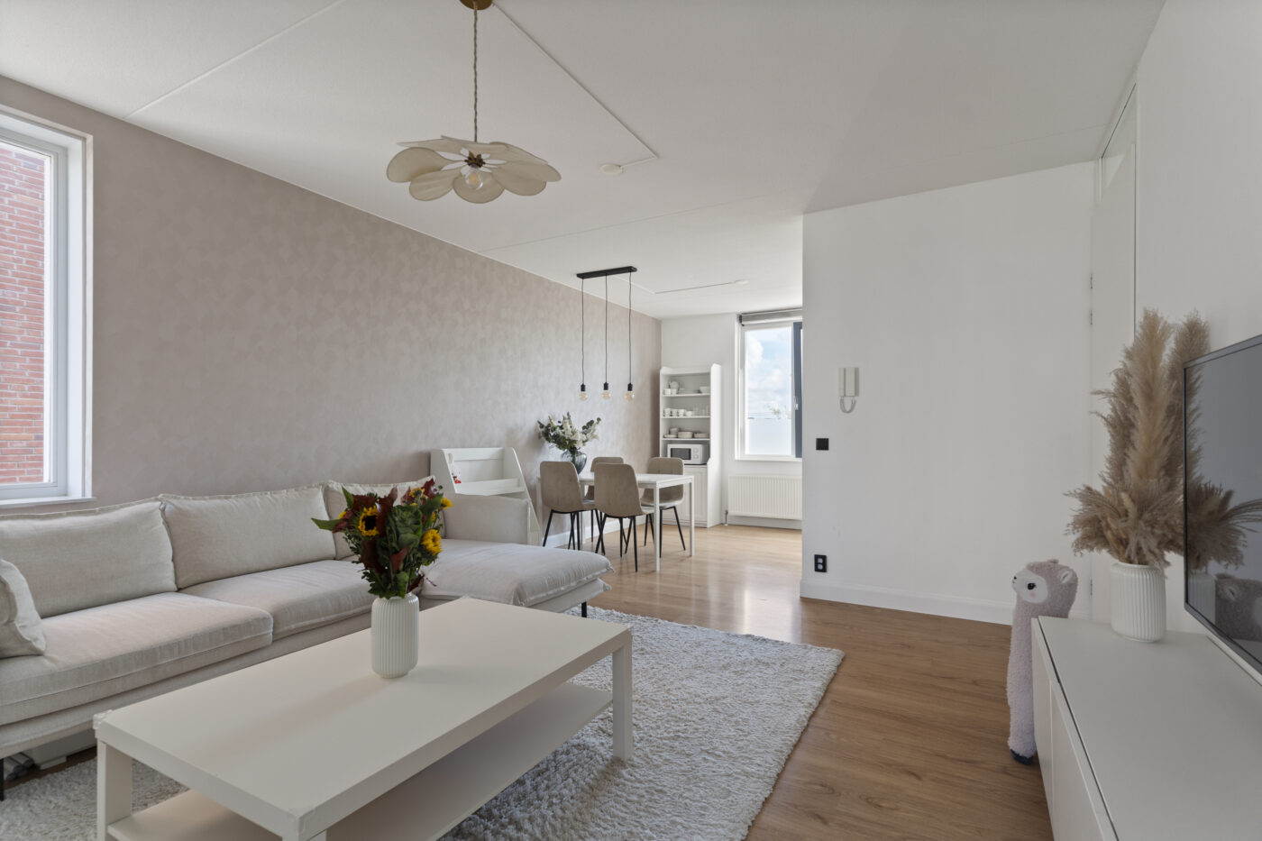 Bij binnenkomst valt direct de lichte en nette afwerking op: een mooie laminaatvloer door het hele appartement en wanden met een leuk behangwerkje zorgen voor een warme uitstraling. De woonkamer is knus maar praktisch ingedeeld en biedt genoeg ruimte voor een gezellige zithoek en eettafel.