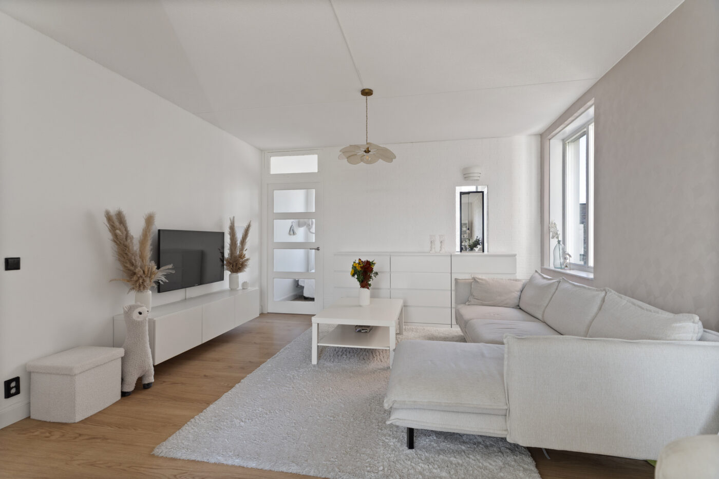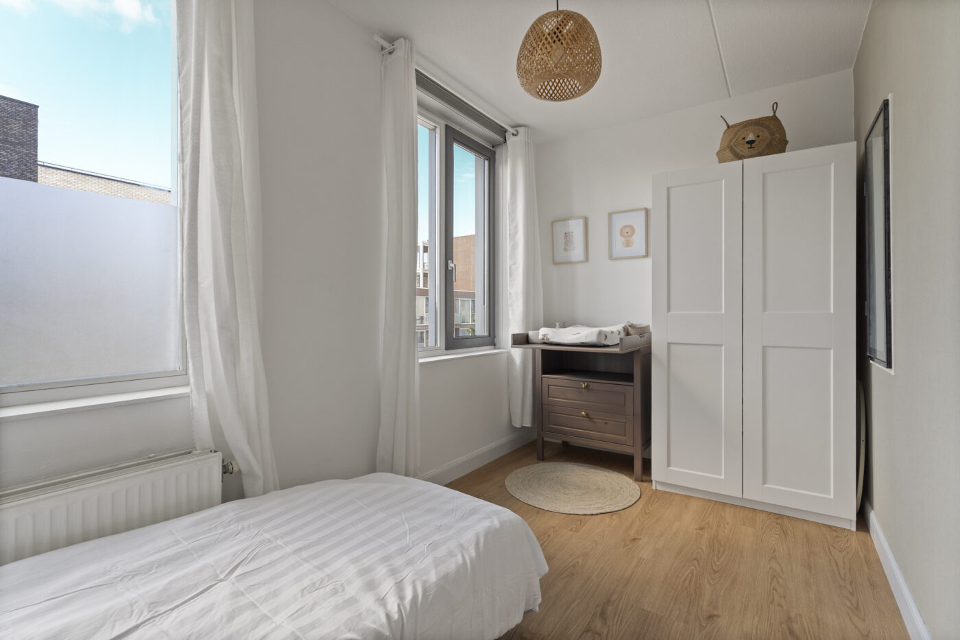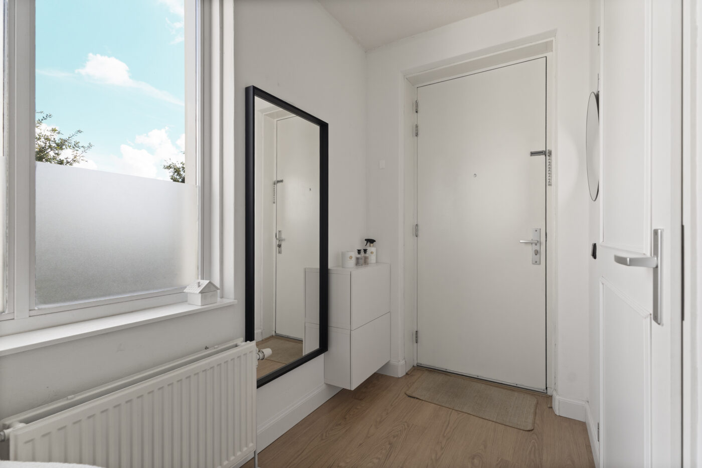 Bij binnenkomst valt direct de lichte en nette afwerking op: een mooie laminaatvloer door het hele appartement en wanden met een leuk behangwerkje zorgen voor een warme uitstraling. De woonkamer is knus maar praktisch ingedeeld en biedt genoeg ruimte voor een gezellige zithoek en eettafel.