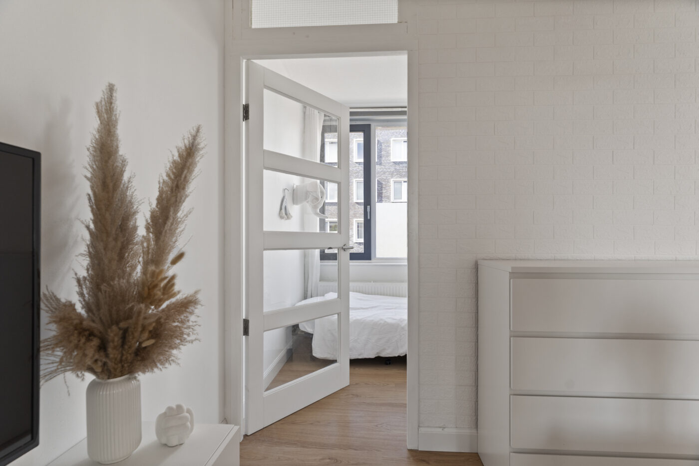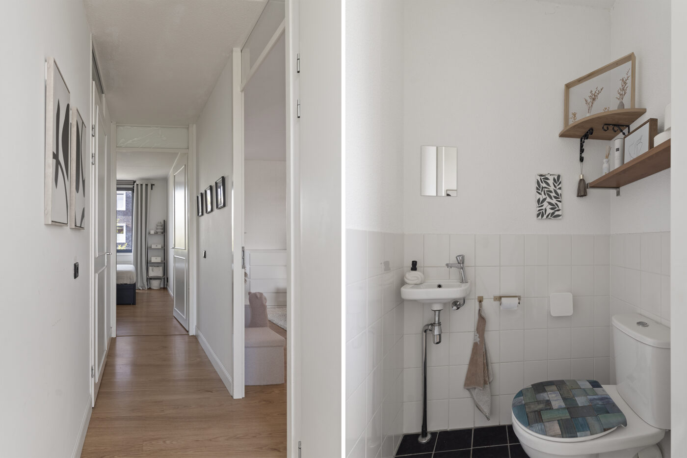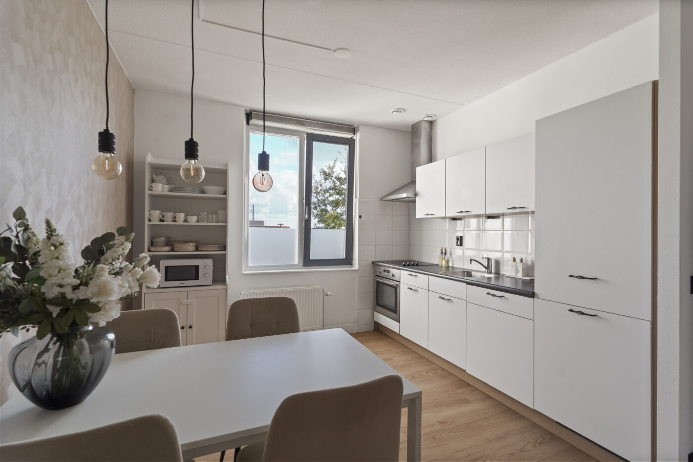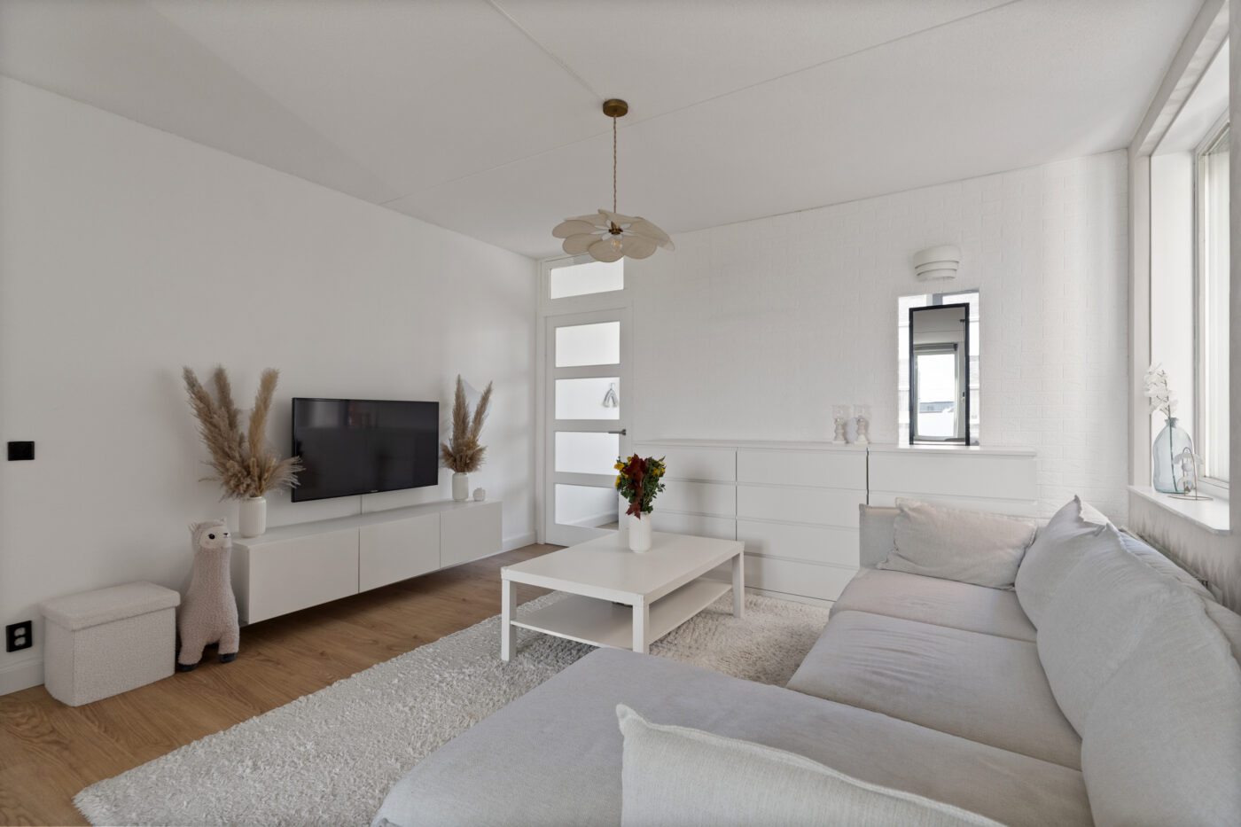 Bij binnenkomst valt direct de lichte en nette afwerking op: een mooie laminaatvloer door het hele appartement en wanden met een leuk behangwerkje zorgen voor een warme uitstraling. De woonkamer is knus maar praktisch ingedeeld en biedt genoeg ruimte voor een gezellige zithoek en eettafel.