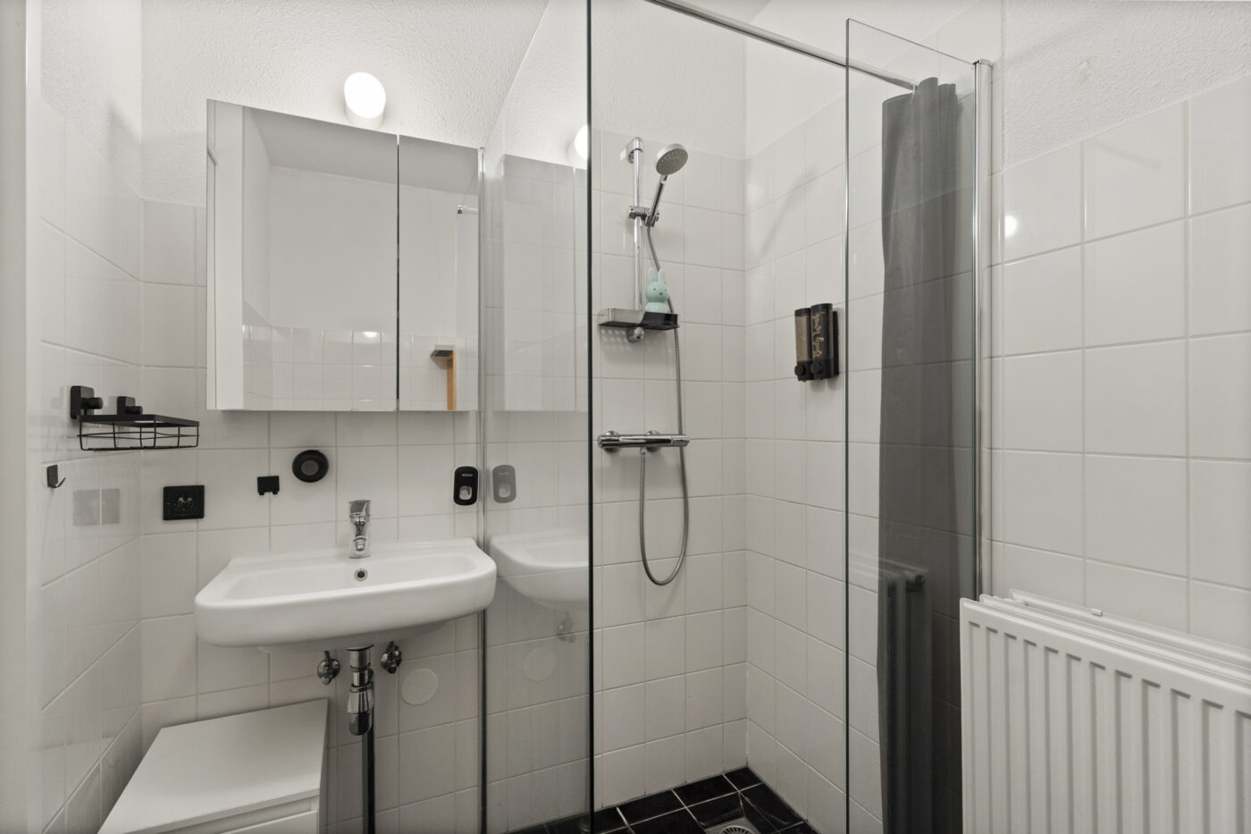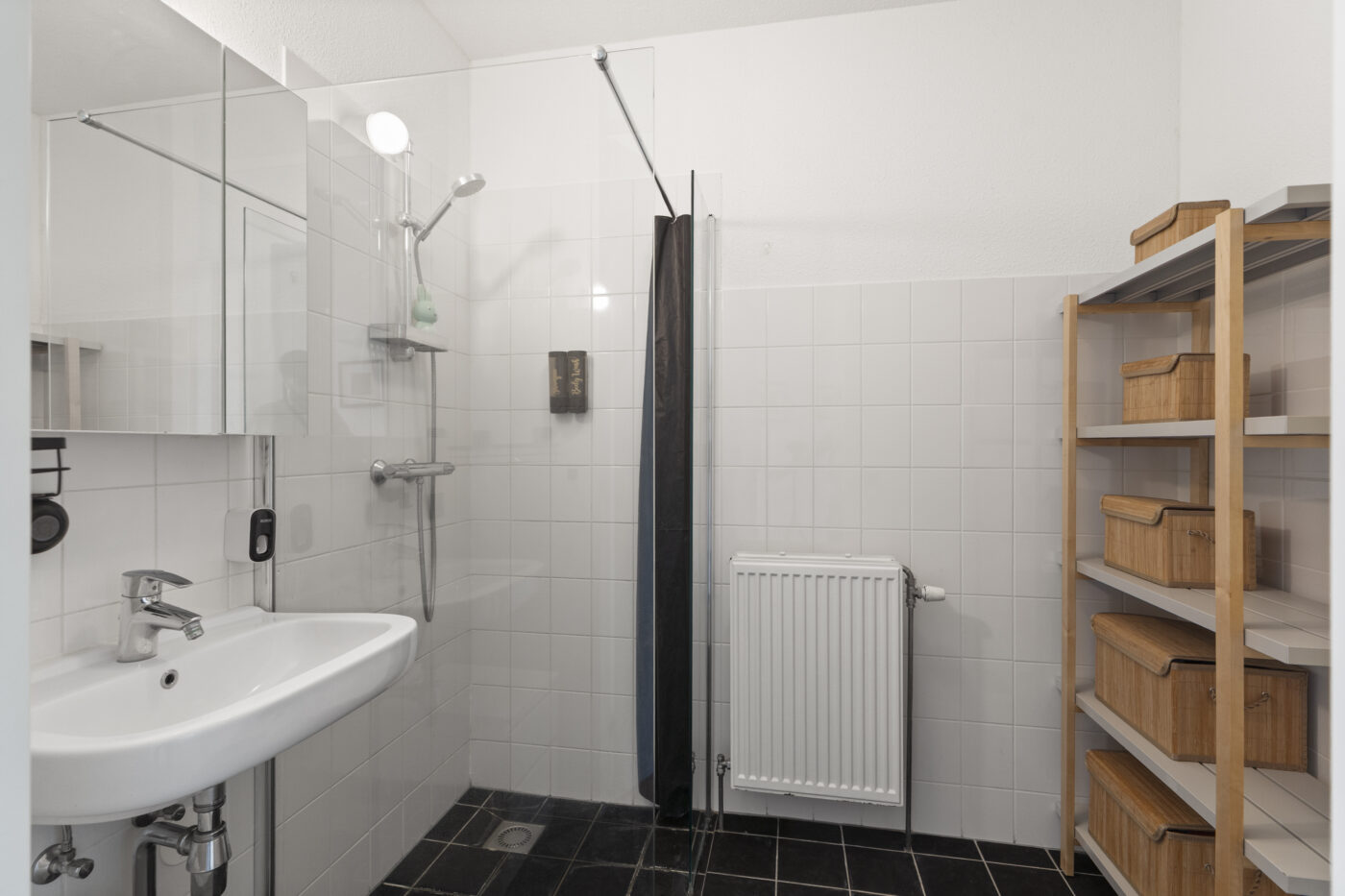 The kitchen is modern and fully equipped with a dishwasher, induction cooktop, extractor hood, oven, microwave, refrigerator, and freezer. The bathroom is neat and features a walk-in shower and sink. There are also two bedrooms, a separate toilet, and a spacious storage/laundry room, perfect for tidy storage. There’s also a storage unit in the apartment complex for your bicycle(s) or other belongings.