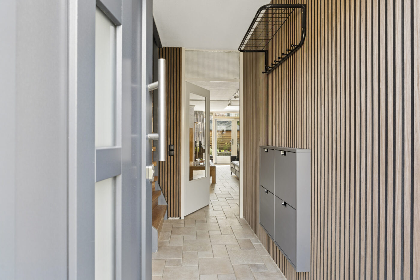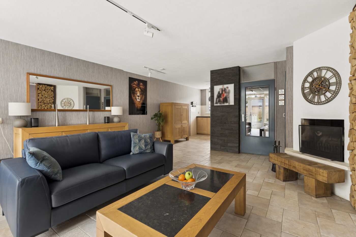 Through the PVC front door, you enter the hall featuring a wardrobe, meter cupboard, and a toilet with a washbasin. There is also a built-in shoe cabinet and an illuminated mirror, and the entire space is beautifully finished with wainscoting. The living room features a tiled floor with underfloor heating and a cozy fireplace. Thanks to the extension with a skylight, there is extra space and pleasant natural light. The open kitchen is equipped with a dishwasher, oven, microwave, induction hob, refrigerator, and freezer. The front and back gardens are well-maintained and neatly landscaped. In the backyard, there is an attached shed and a covered area where garden tools or miscellaneous items can be stored.