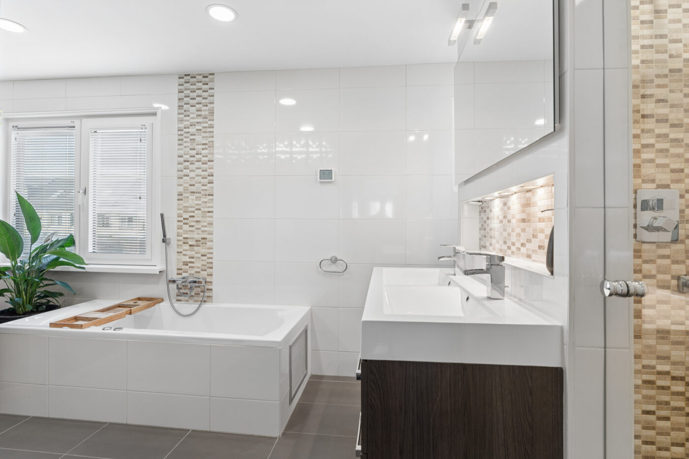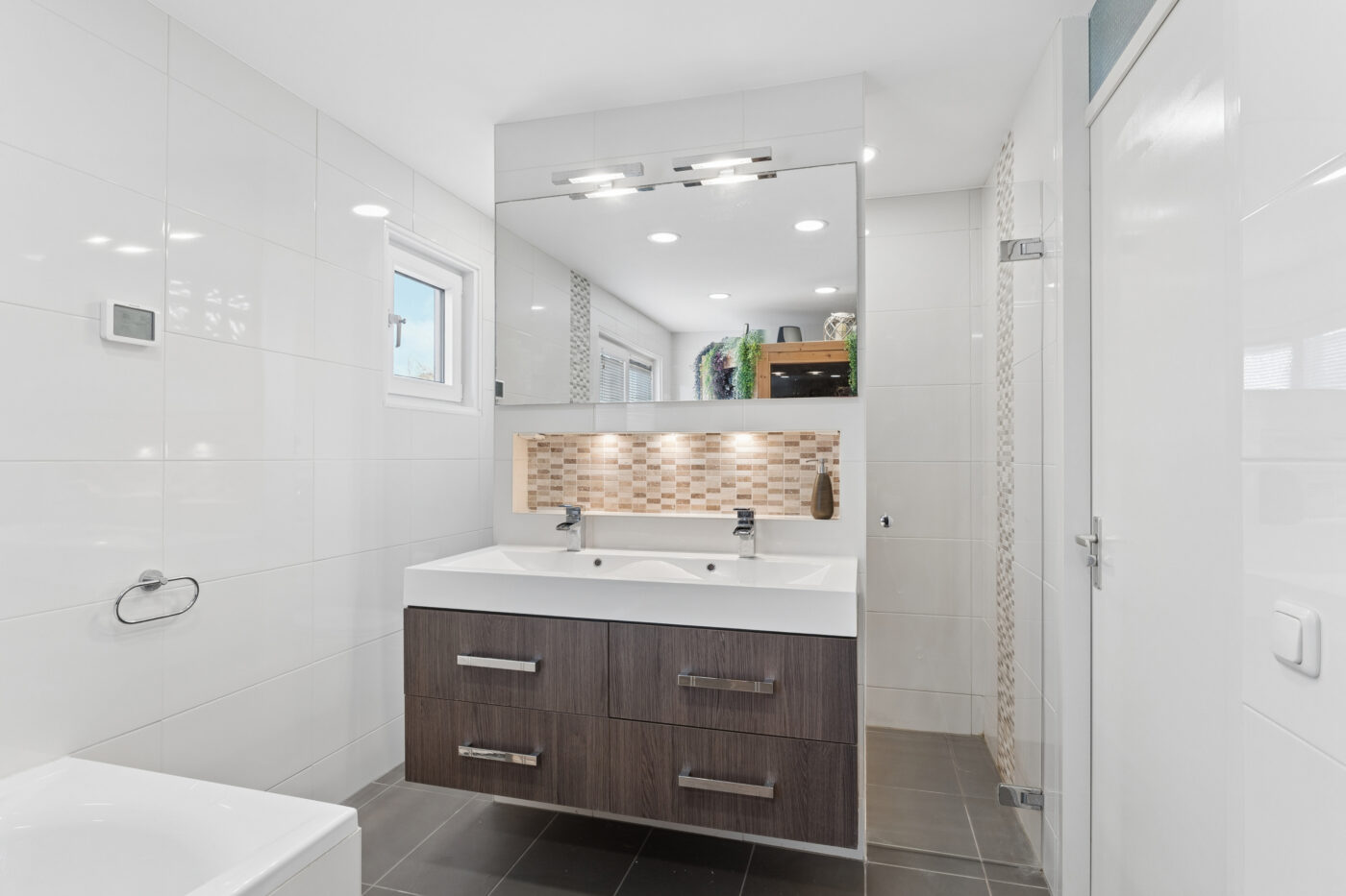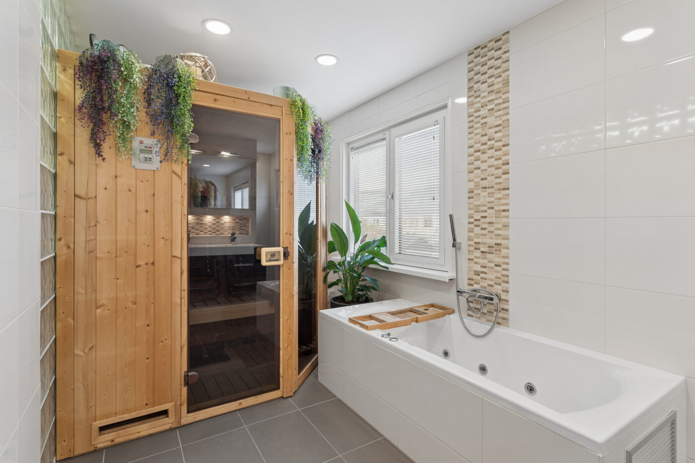 You reach the first floor via the staircase with laminate flooring and lighting. Here, you will find two bedrooms (currently one used as a home office) and a spacious walk-in closet. The extended bathroom is fully equipped with underfloor heating, a toilet, a double sink, a shower cabin, a whirlpool, a heated mirror and a sauna. The ceiling is plastered and fitted with spotlights.