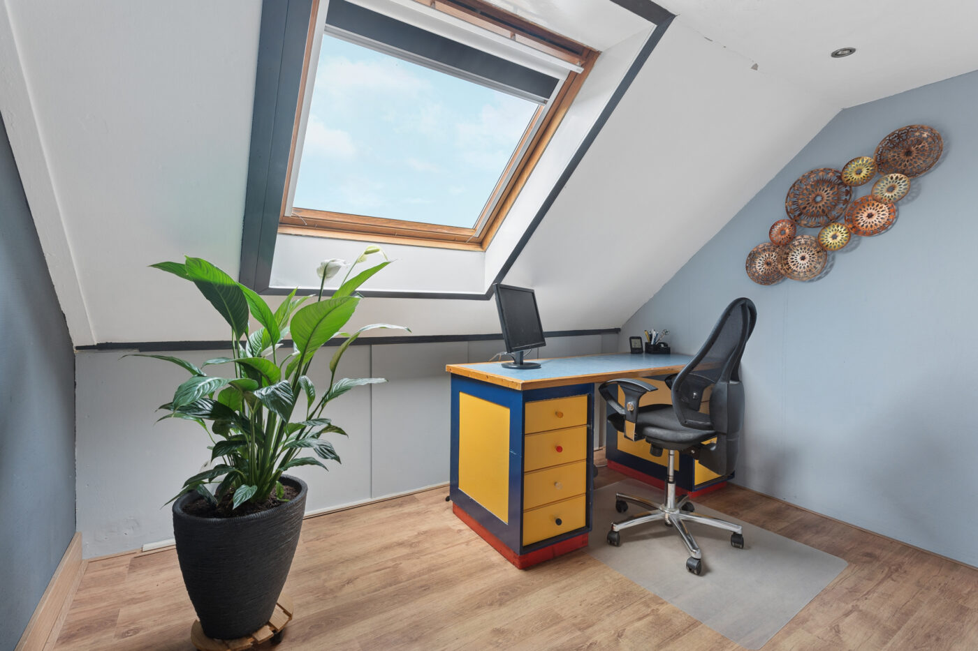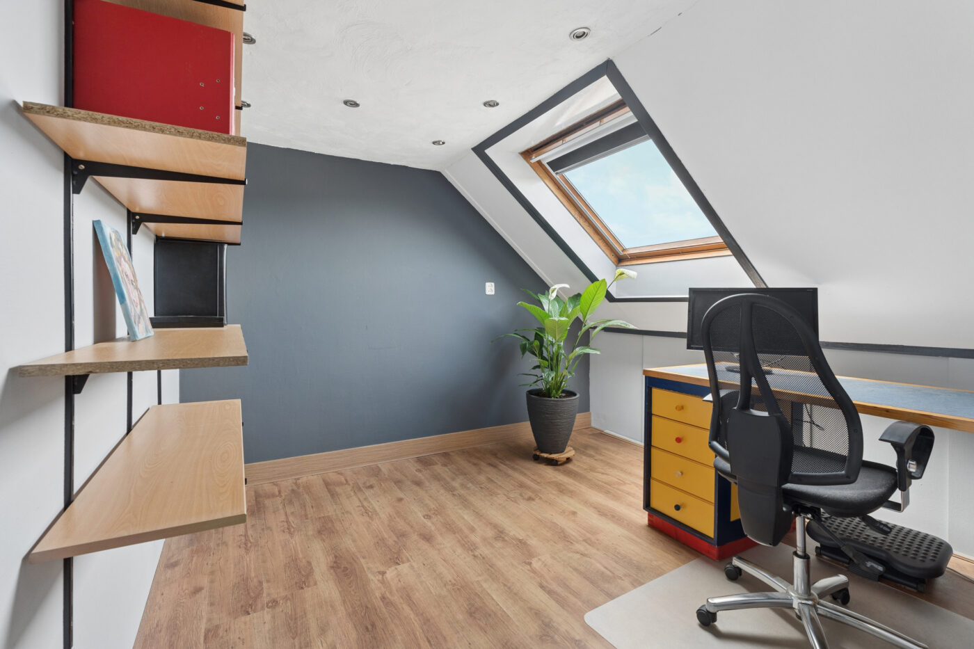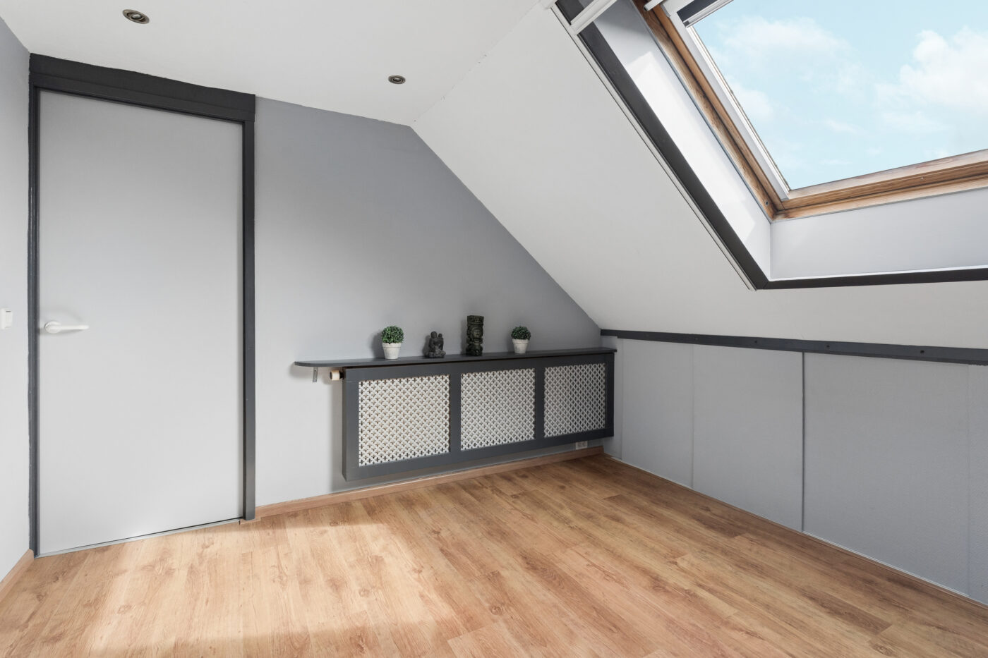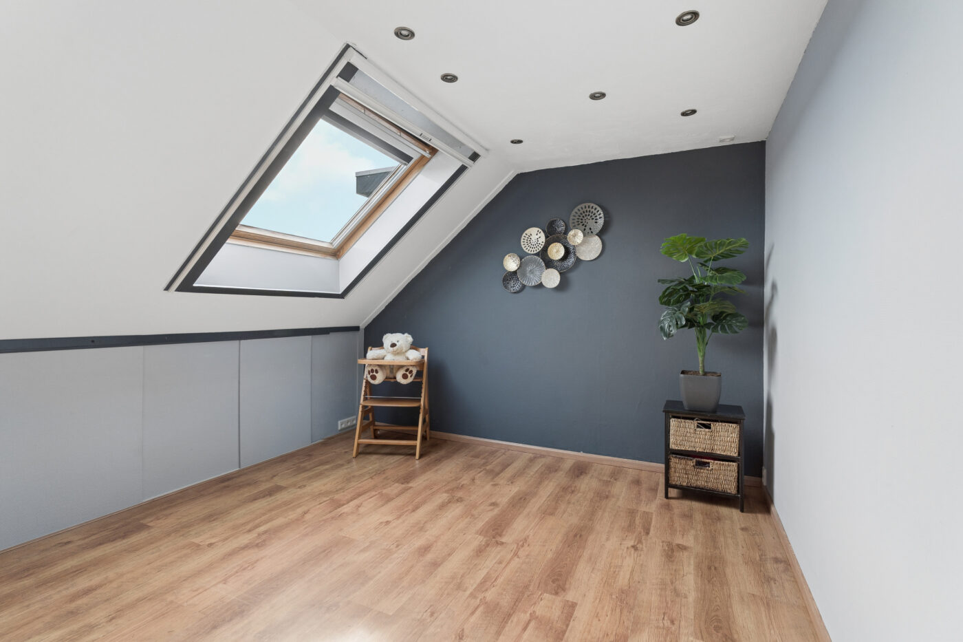 The second floor offers another two bedrooms, a laundry room, and a storage room. Additionally, there is extra storage space thanks to the knee walls and the loft. The Velux skylights provide pleasant daylight, and the inverter for the 18 solar panels is also located here.