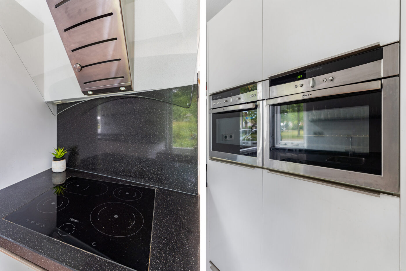 The living area is accessed through the hallway with a toilet, meter cupboard, and access to the garage. The garden-facing living room features large windows and sliding doors to the back garden, creating a beautiful connection between indoors and outdoors. At the front of the house is the open-plan kitchen, equipped with all modern appliances: an induction cooktop, extractor hood, dishwasher, combination oven/microwave, and refrigerator. There’s also ample space for a generous dining table, perfect for enjoying meals overlooking the green park. The ground floor also features Luxaflex electric roller blinds with PowerView, both at the front and rear.
