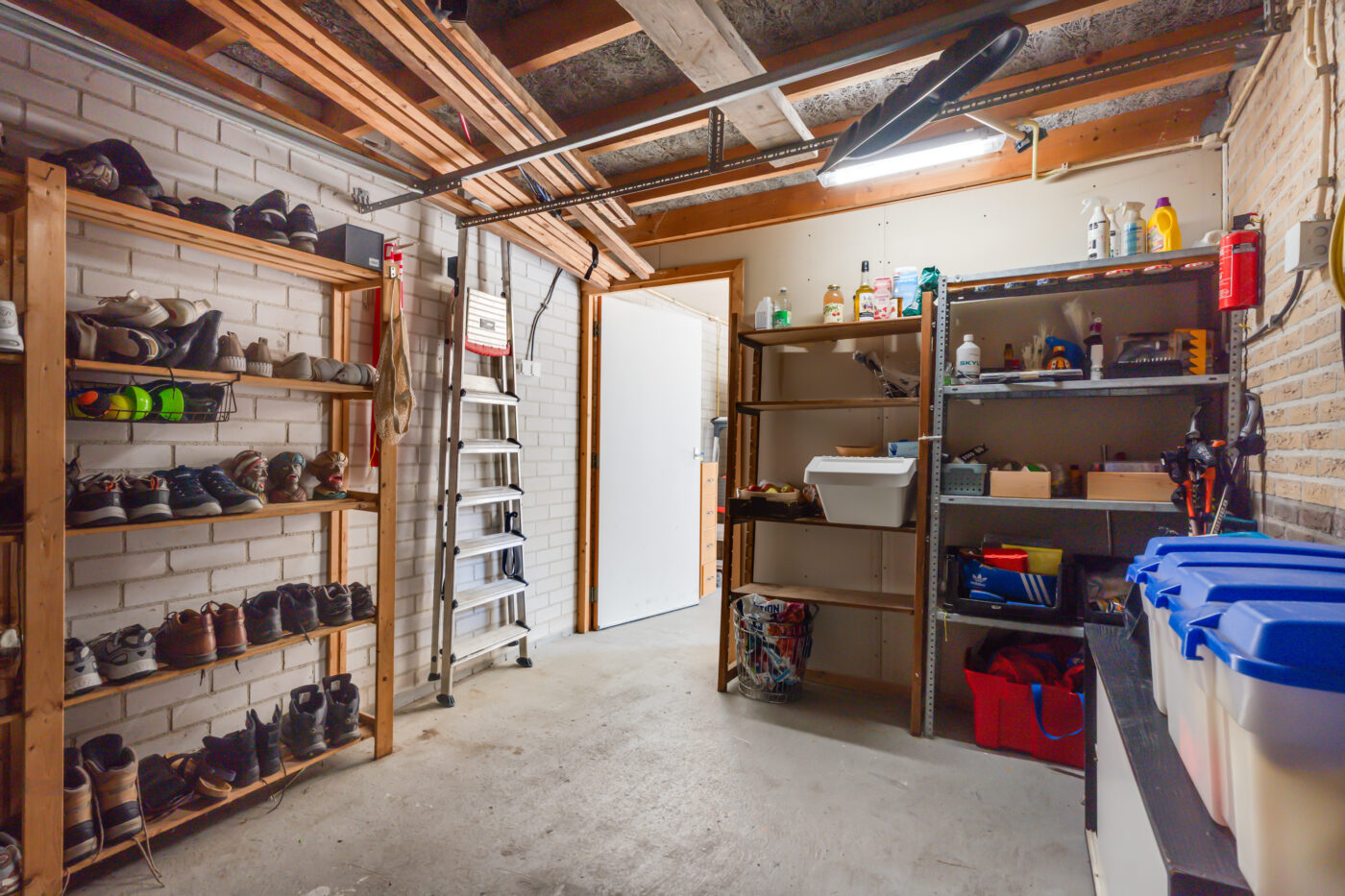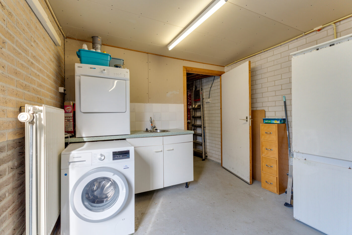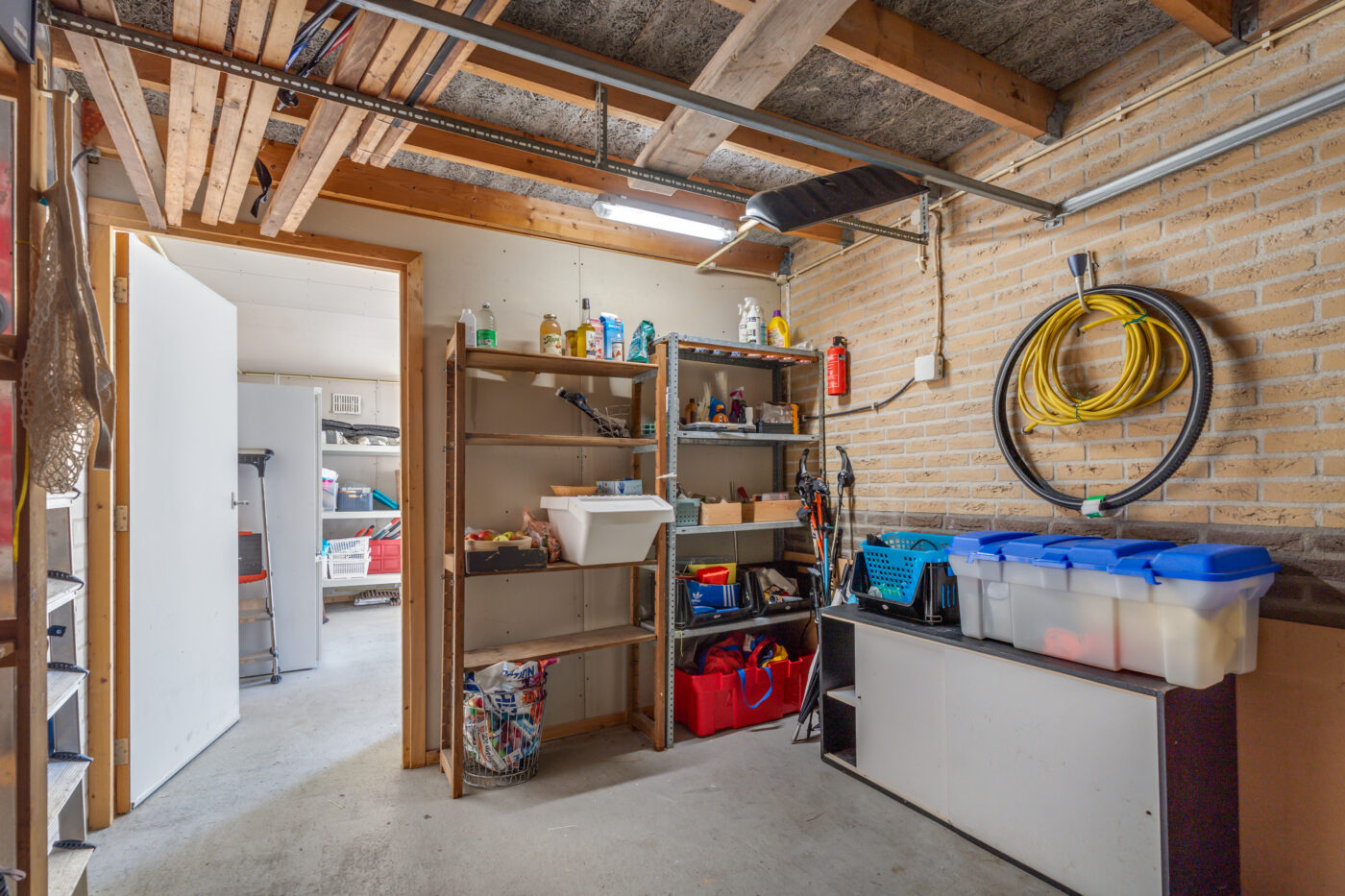 De garage wordt momenteel gebruikt als bijkeuken/wasruimte en opslag, maar kan desgewenst deels bij de woonkamer worden betrokken, ideaal voor wie nog meer leefruimte wil creëren.