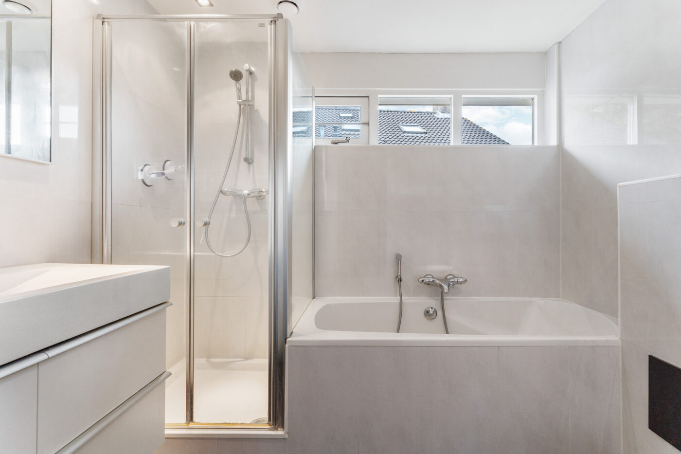 De overloop biedt toegang tot drie slaapkamers (waarvan één ruim en twee van medium formaat, die eventueel samengevoegd kunnen worden tot één grote kamer). Verder vind je hier een praktische berging en een complete badkamer met ligbad, aparte douche, wastafel, vrijhangend toilet en ramen voor daglicht en ventilatie.