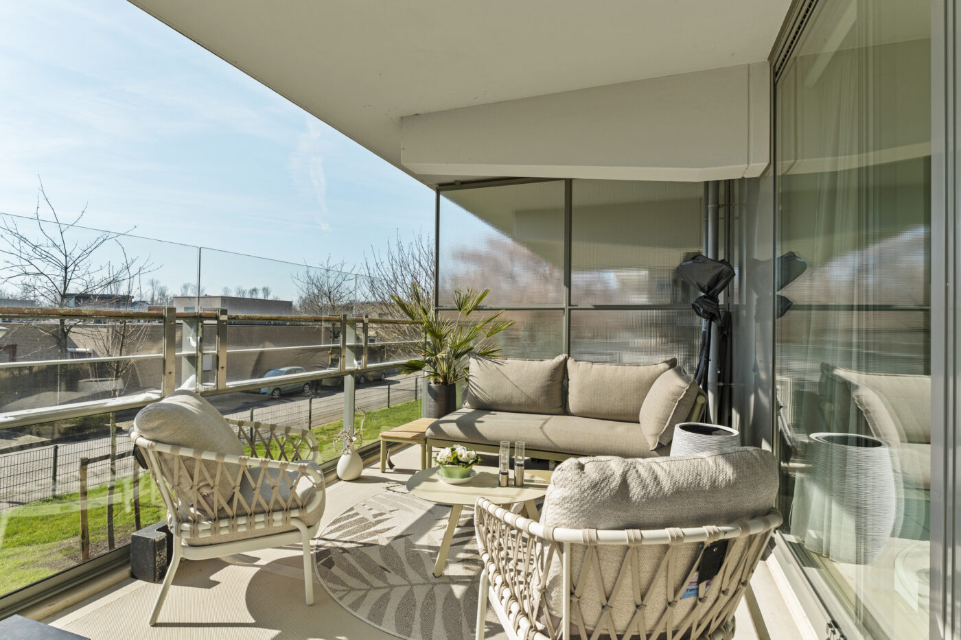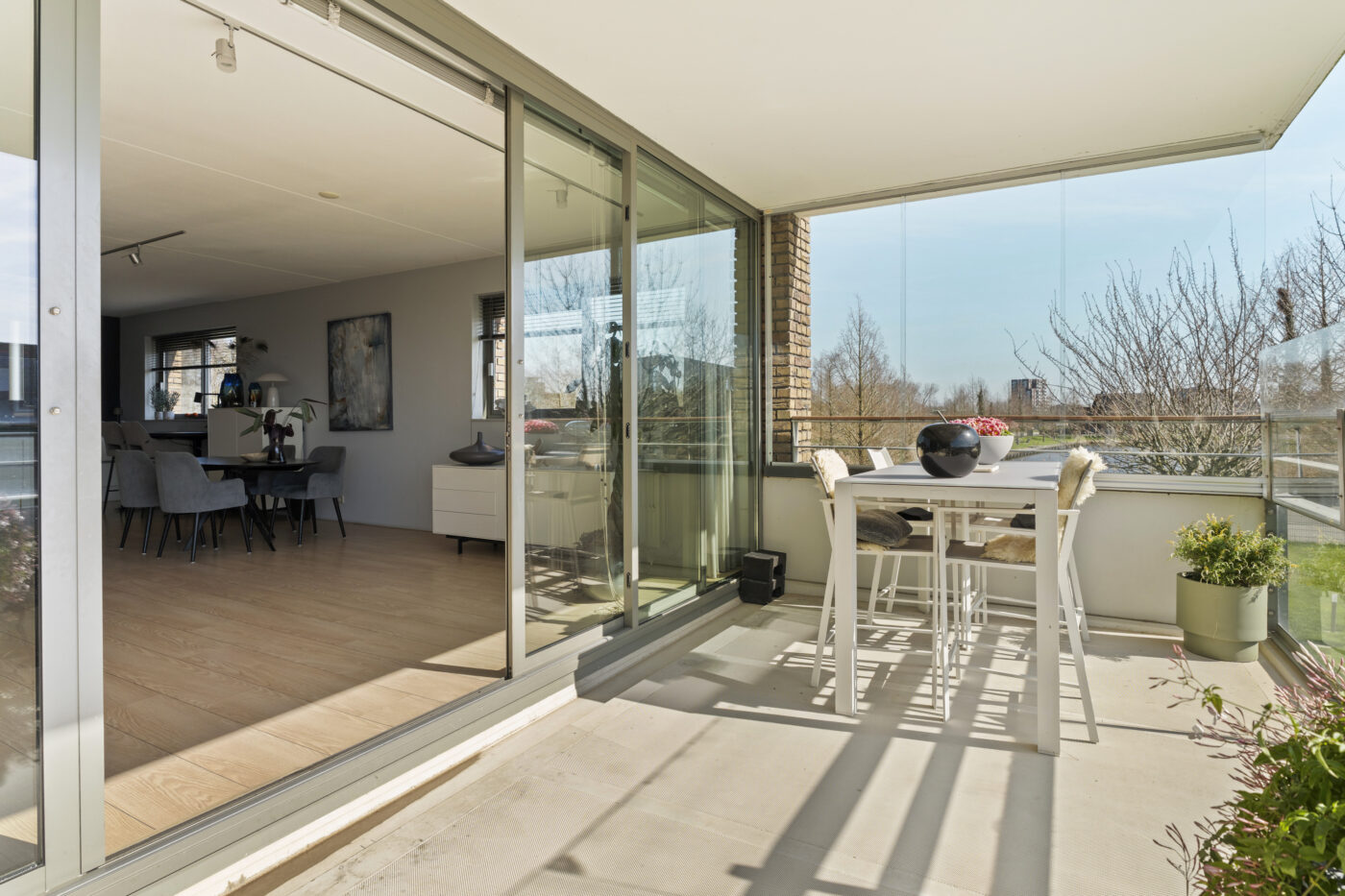 Via de schuifdeuren stapt u zo het riante, overdekte balkon op, gelegen op het zuiden en over de volledige breedte van het appartement. Hier geniet u het hele jaar door van rust, ruimte en een sfeervolle buitenbeleving.