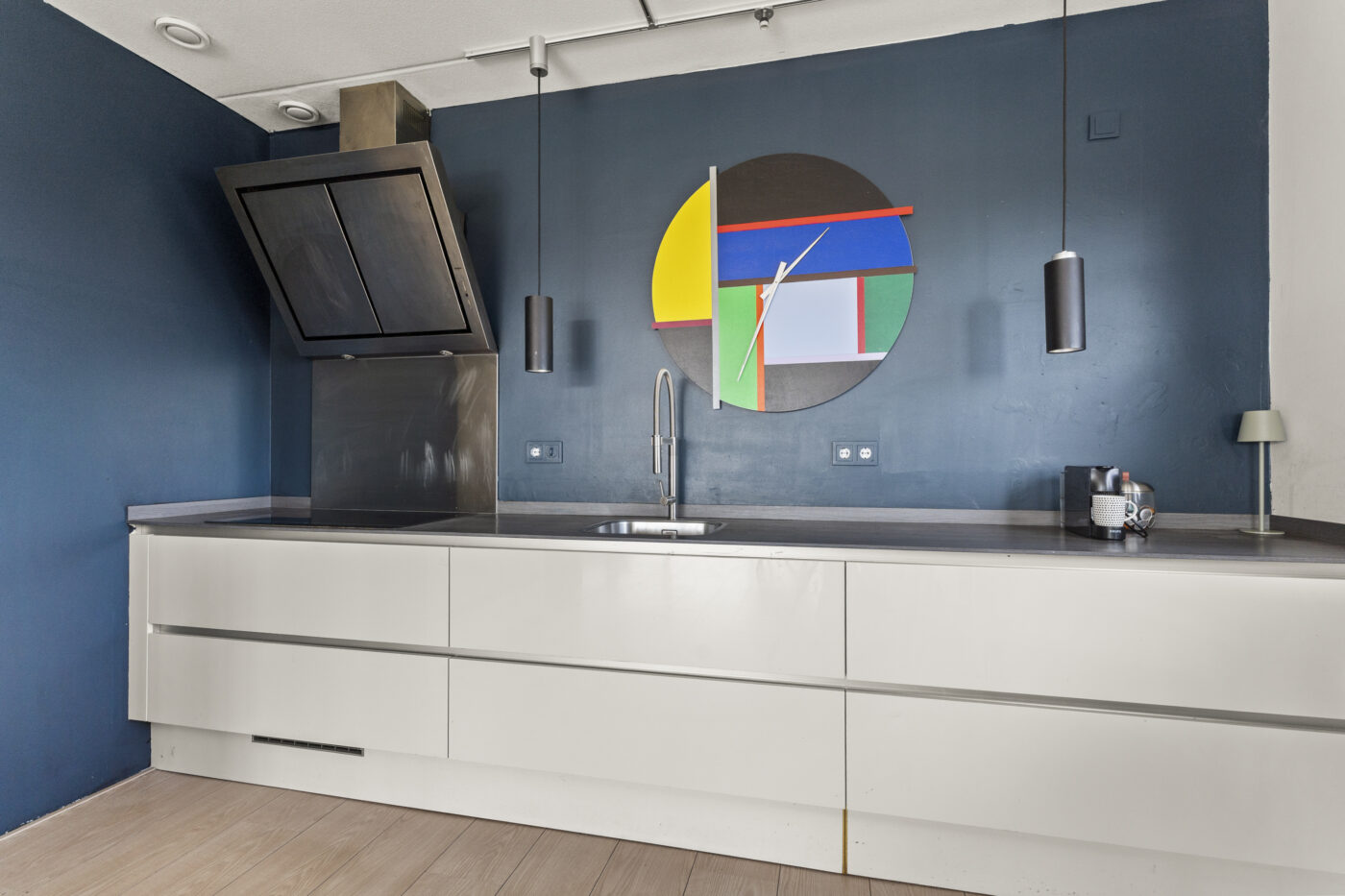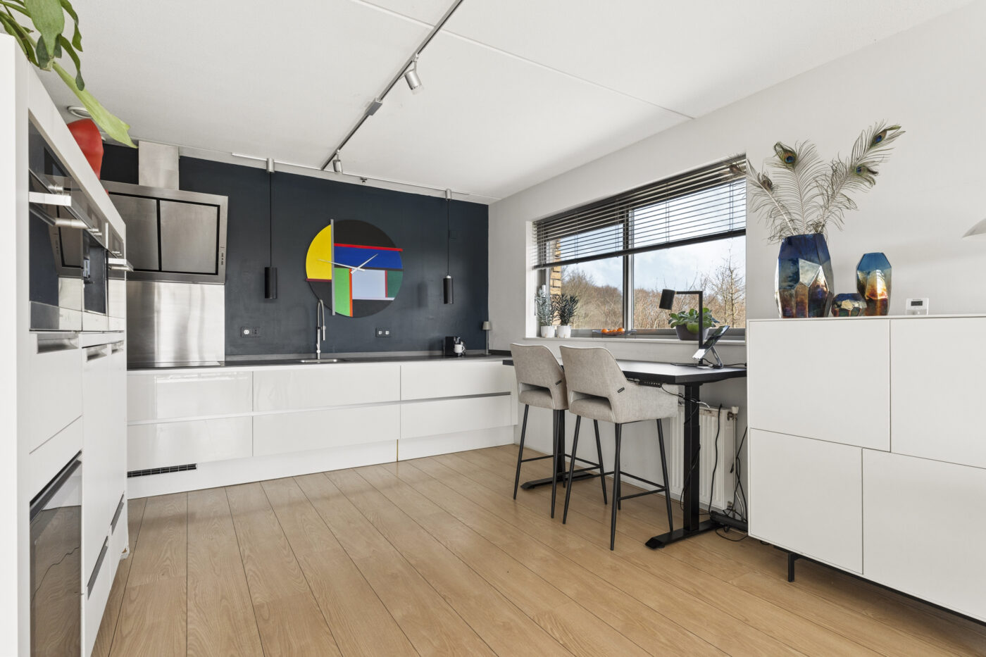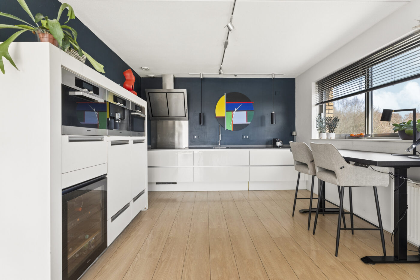 De moderne open keuken is van alle gemakken voorzien en strak vormgegeven. Denk aan een kookplaat, afzuigkap, oven, magnetron, wijnkoeler en een vaatwasser op comfortabele hoogte. De koelkast is praktisch geplaatst in de bijkeuken, waardoor de keuken overzichtelijk en ruim blijft.