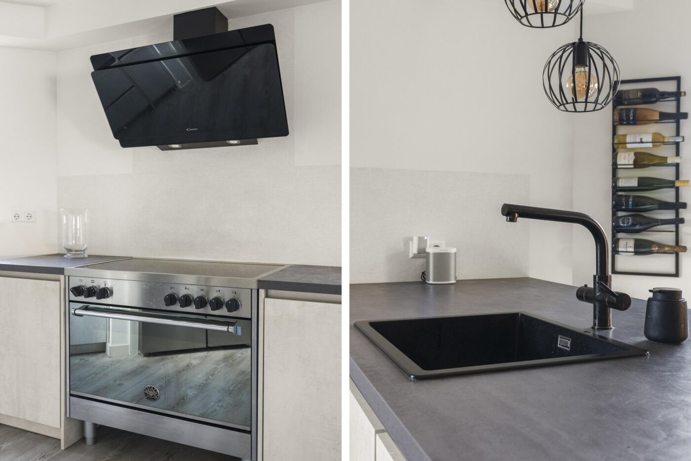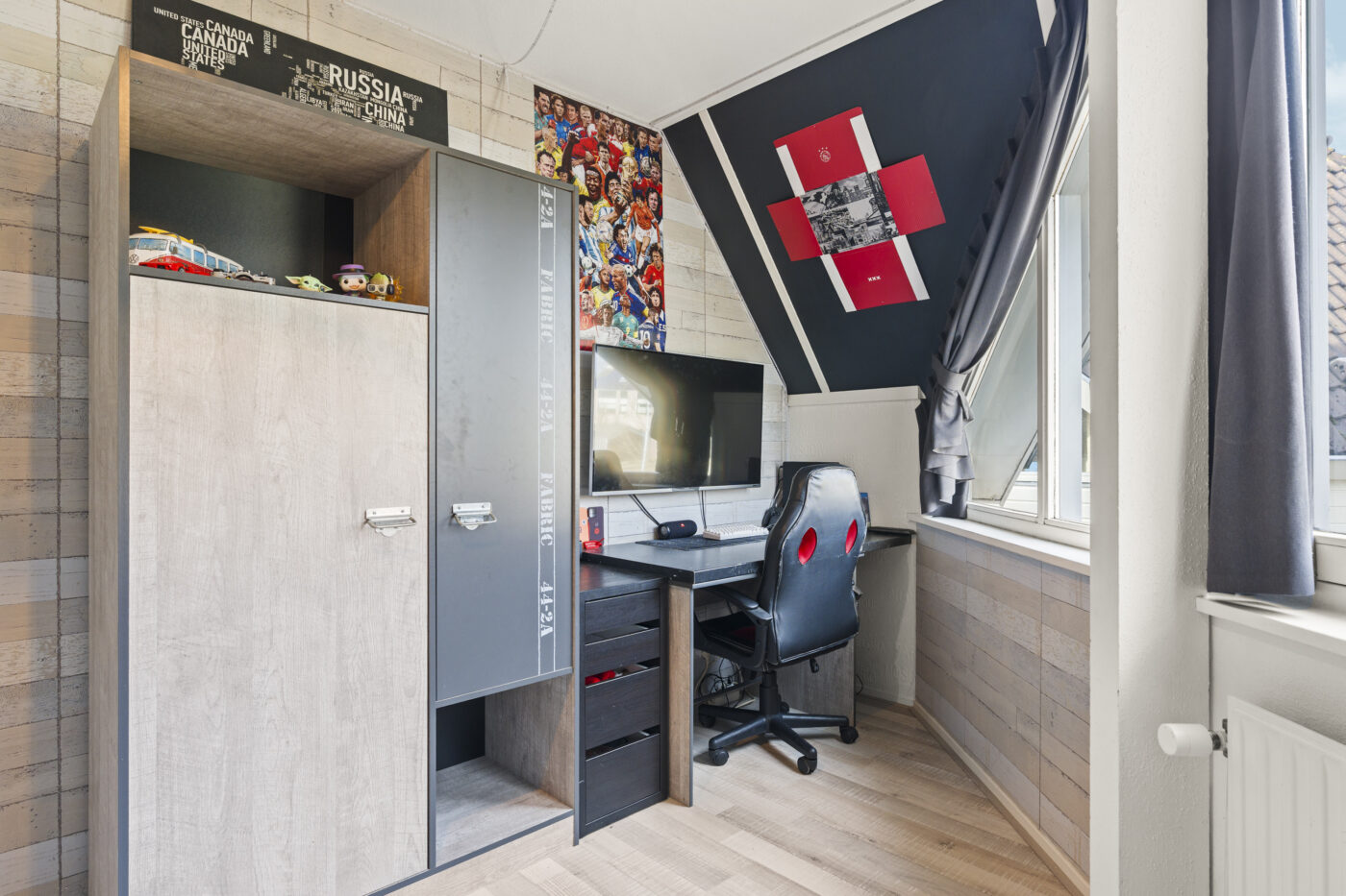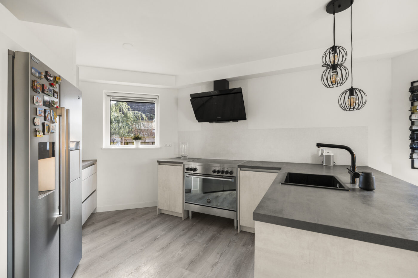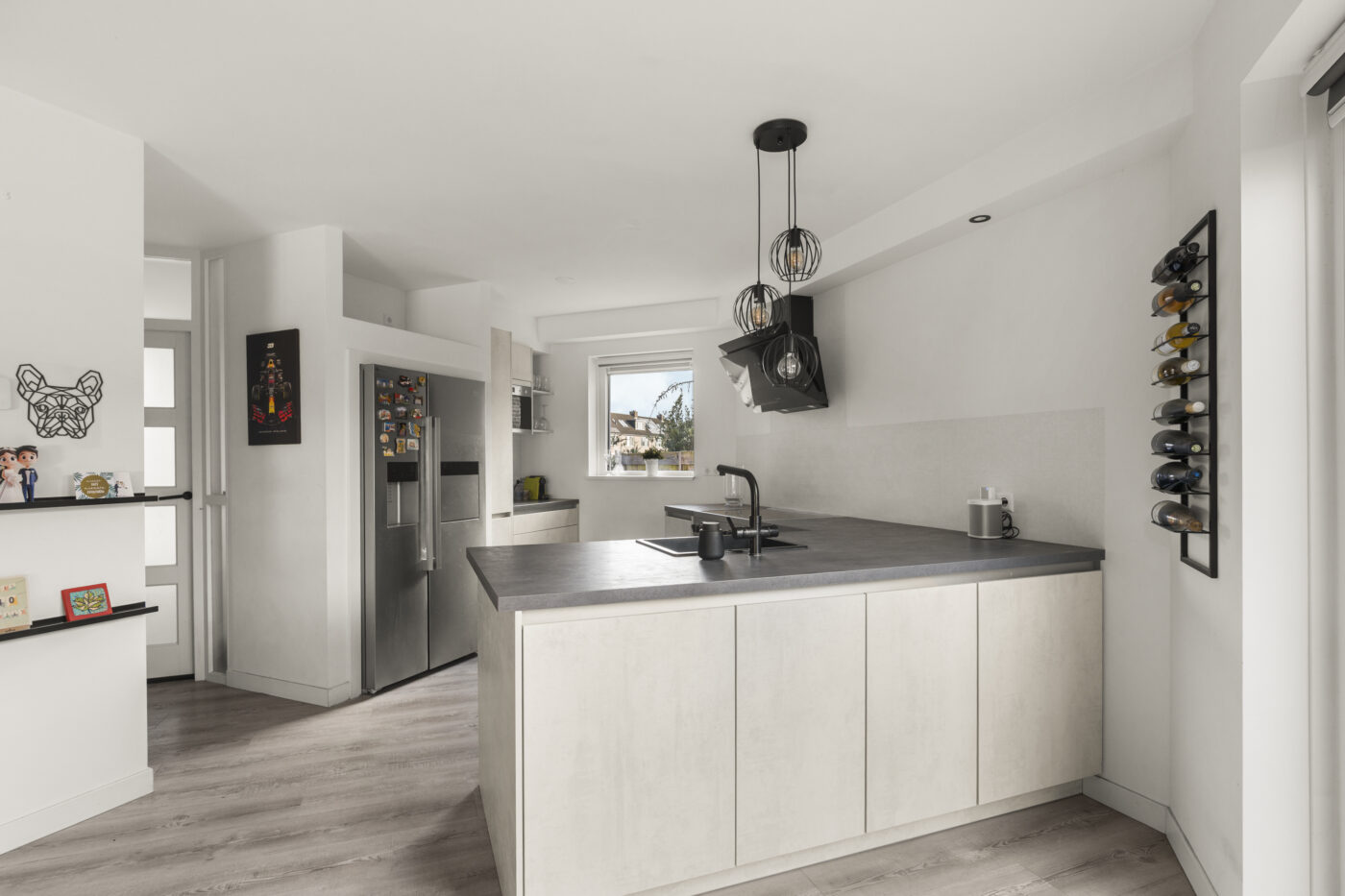 A practical office space has been created alongside the storage room, ideal for working from home or as a hobby room. The modern open-plan kitchen is fully equipped: a dishwasher, American-style fridge-freezer, large oven, microwave, boiling-water tap, and a 5-burner induction cooktop. Enjoy cooking here while staying connected to the living area.