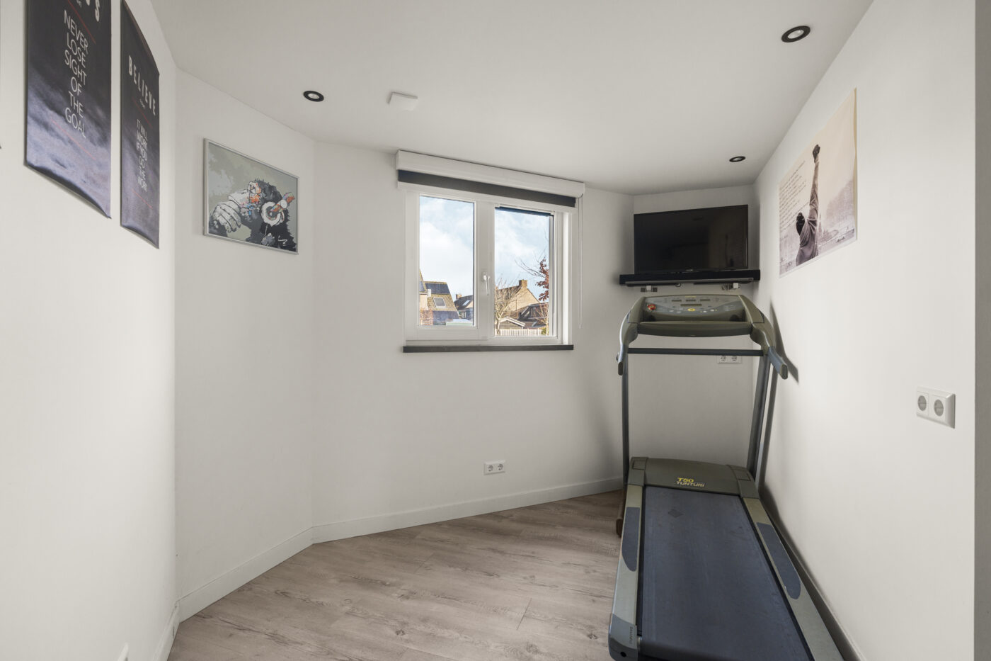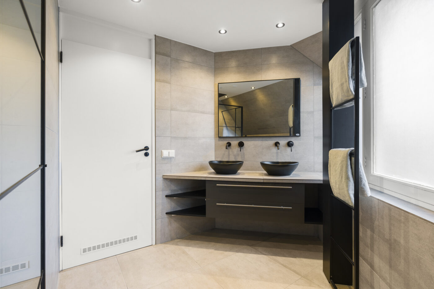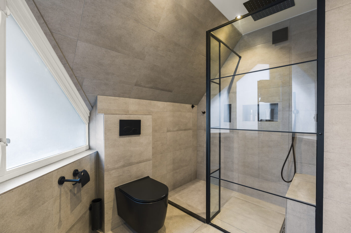 On the first floor, there are three neatly finished bedrooms, all plastered and with beautiful laminate flooring. The luxurious bathroom is a real eye-catcher. It features underfloor heating, a double sink, a spacious walk-in shower with a recessed alcove, a rain shower incorporated into the ceiling, a wall-hung toilet, beautiful windows for natural light, and subtle recessed spotlights for an atmospheric finish.