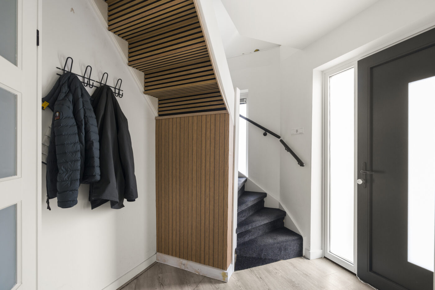 De hal beschikt over een garderobe, modern toilet met fonteintje en een vernieuwde meterkast. Alle kozijnen en deuren op de begane grond zijn uitgevoerd in onderhoudsvriendelijk kunststof. De begane grond is volledig strak afgewerkt met stucwerk en is daarnaast voorzien van vloerverwarming en een stijlvolle PVC-vloer.