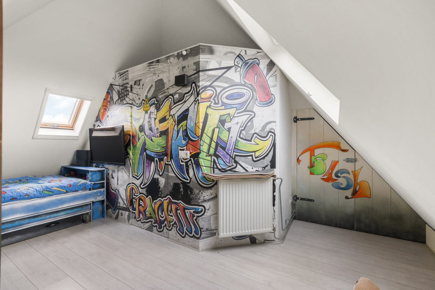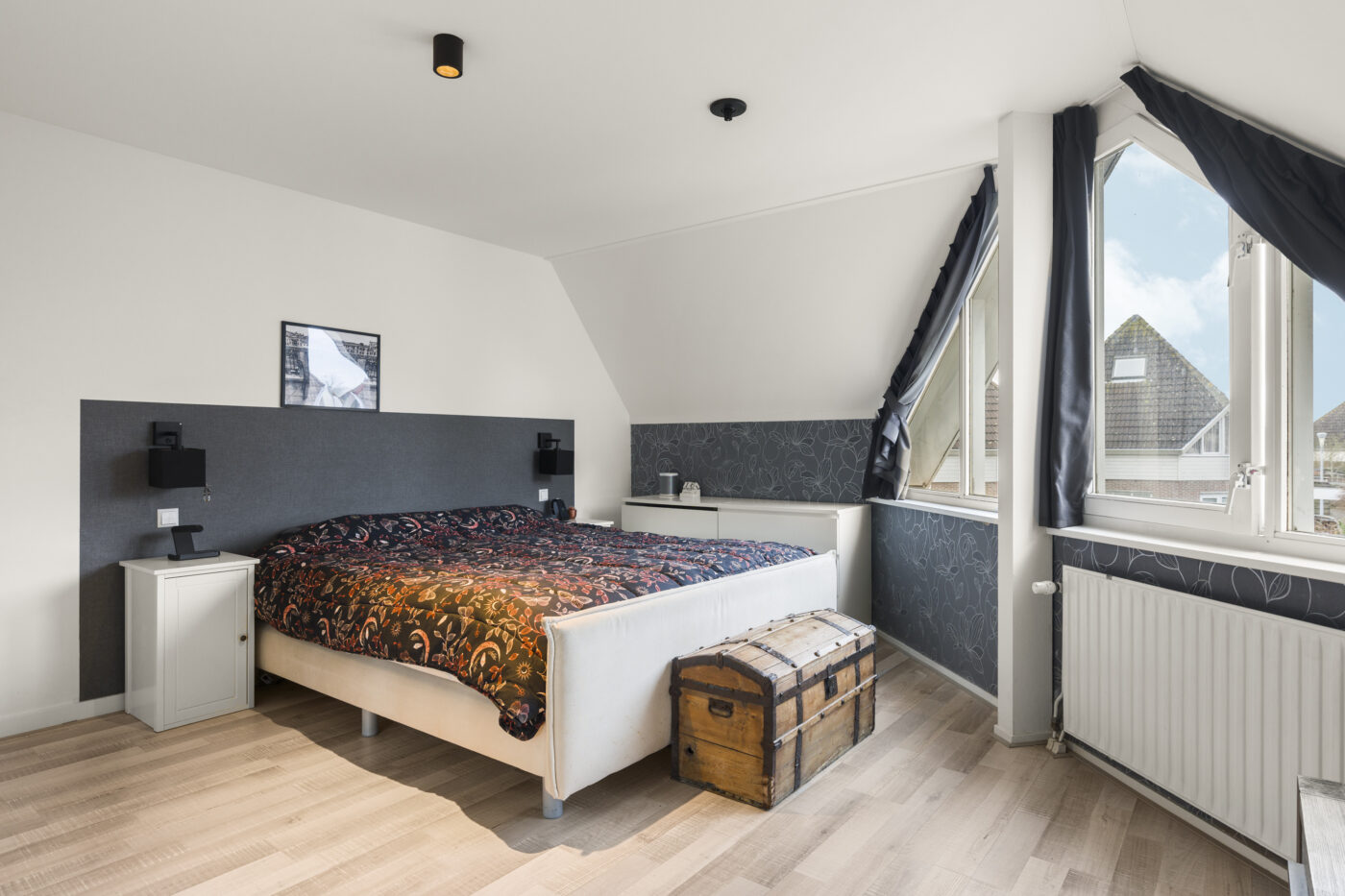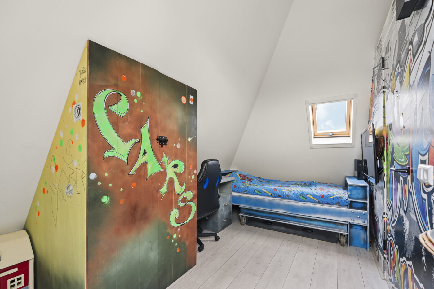 De tweede verdieping biedt nog een extra slaapkamer, een aparte wasruimte en praktische bergruimte met schuifdeuren op de overloop. Dankzij de nieuwe dakramen is ook deze verdieping heerlijk licht. De gehele etage is strak gestuct en afgewerkt met een nette laminaatvloer.