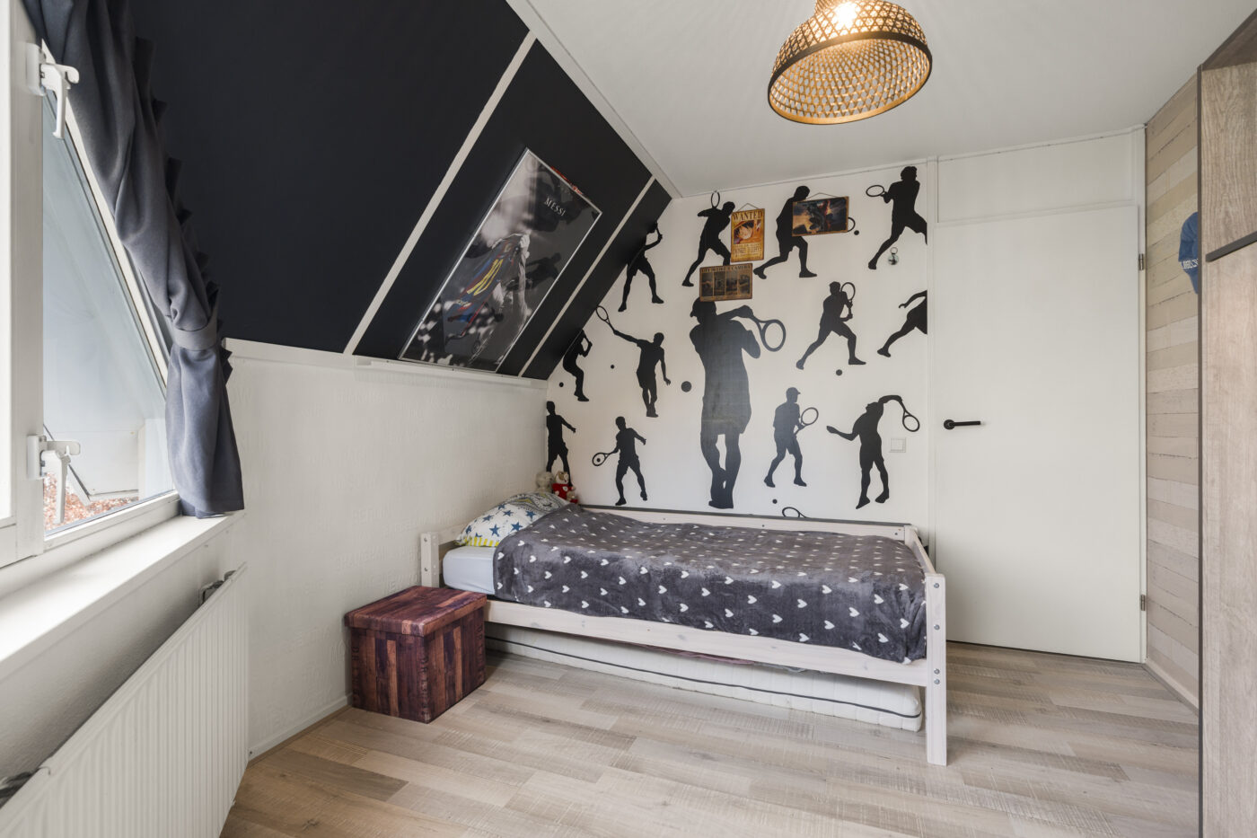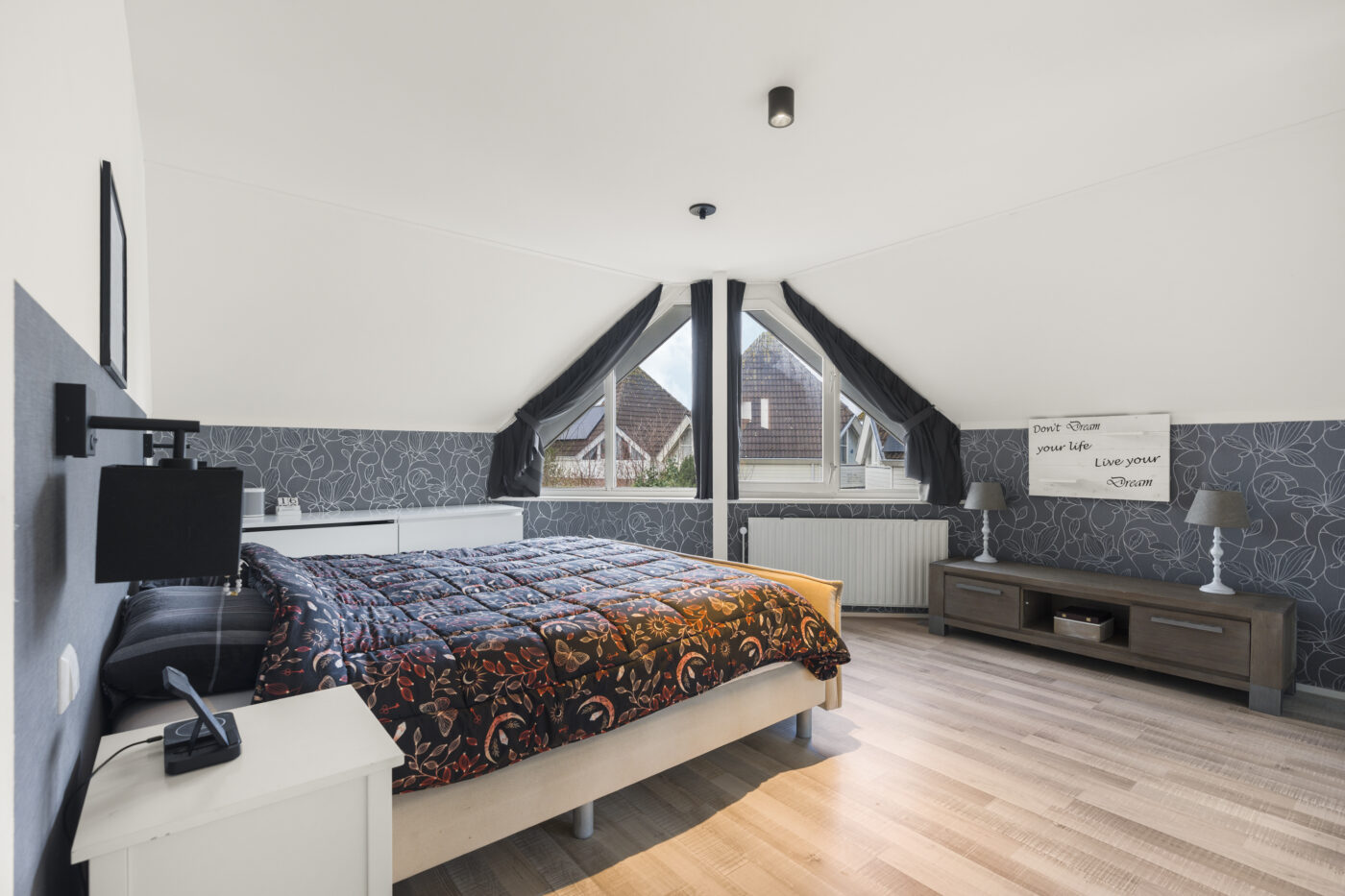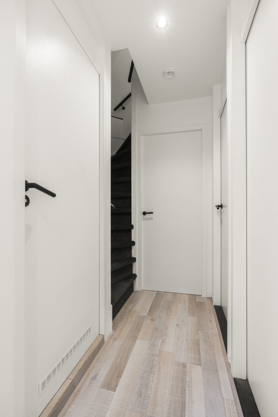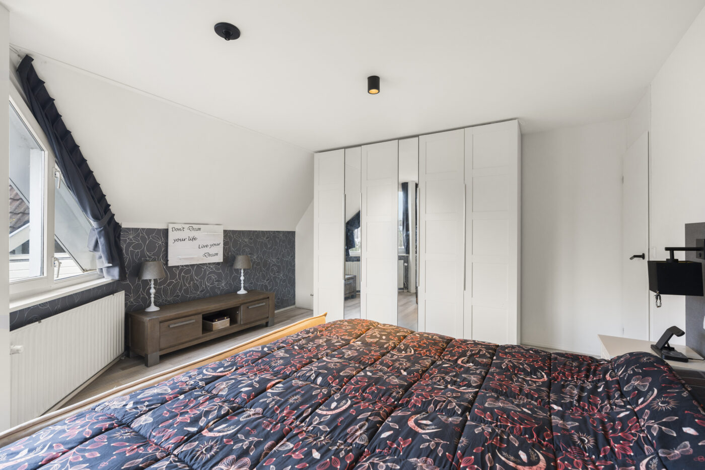 De tweede verdieping biedt nog een extra slaapkamer, een aparte wasruimte en praktische bergruimte met schuifdeuren op de overloop. Dankzij de nieuwe dakramen is ook deze verdieping heerlijk licht. De gehele etage is strak gestuct en afgewerkt met een nette laminaatvloer.